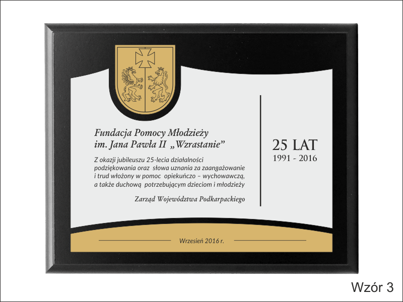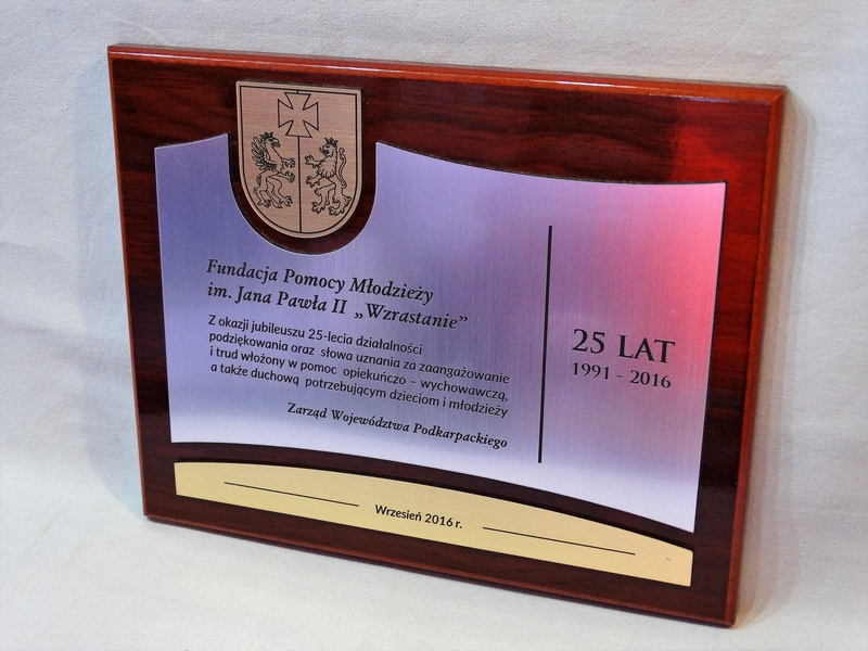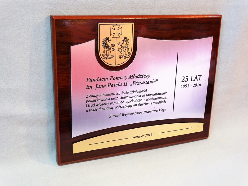 - z dopasowanych do siebie trzech rodzajów laminatów (srebrnego i złotego), z wygrawerowaną dedykacją, herbem, logiem