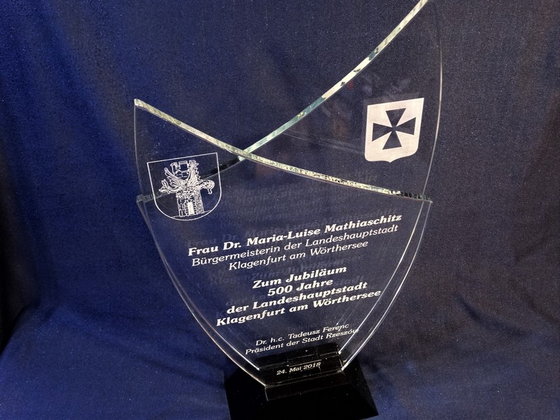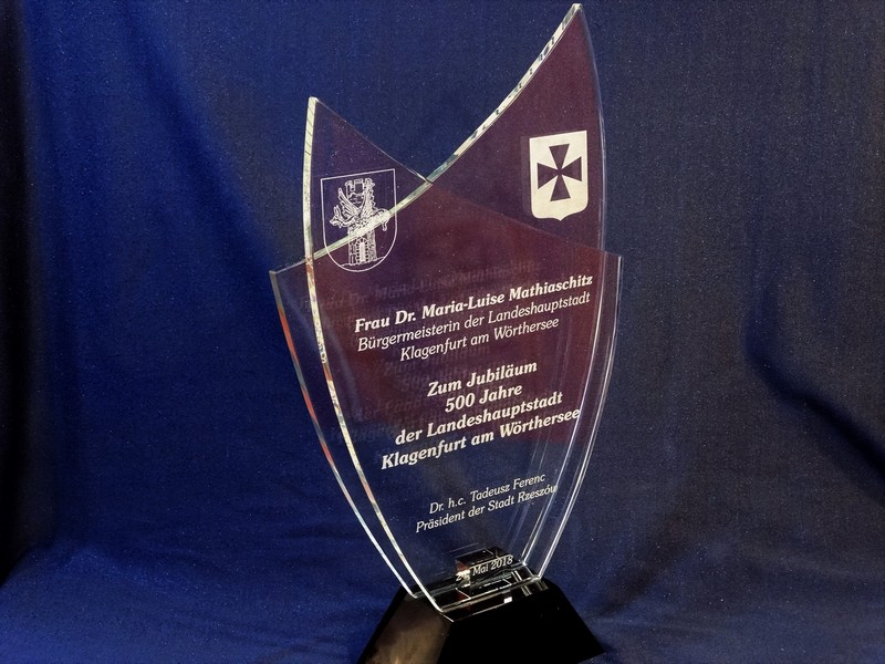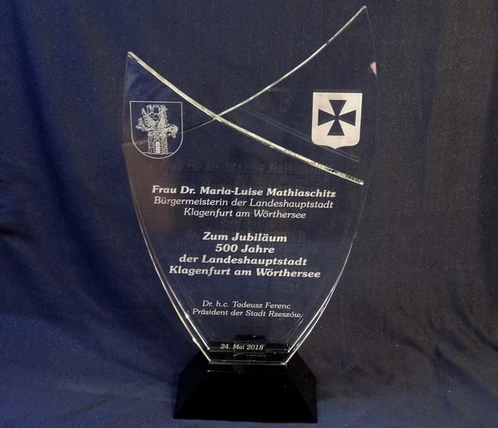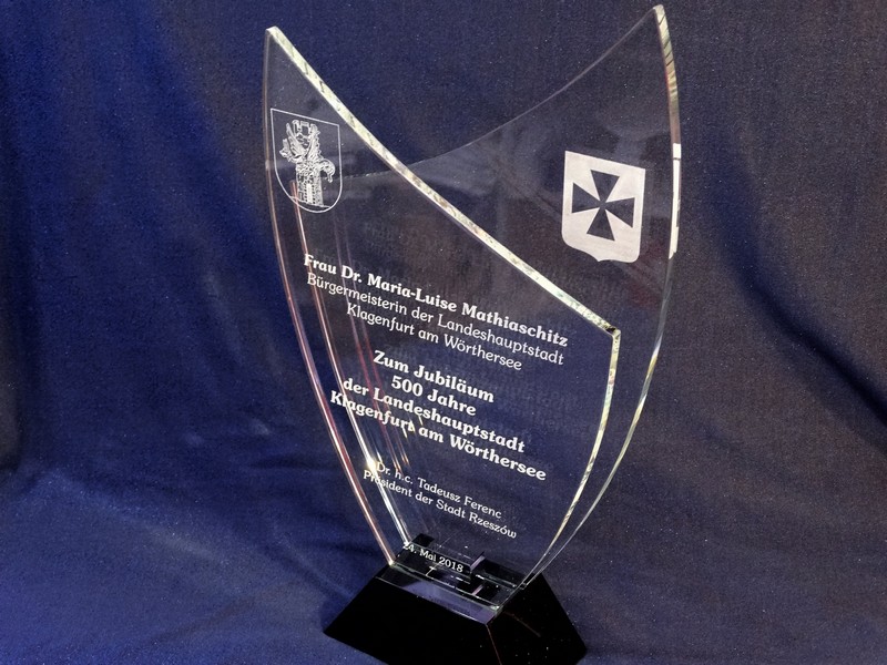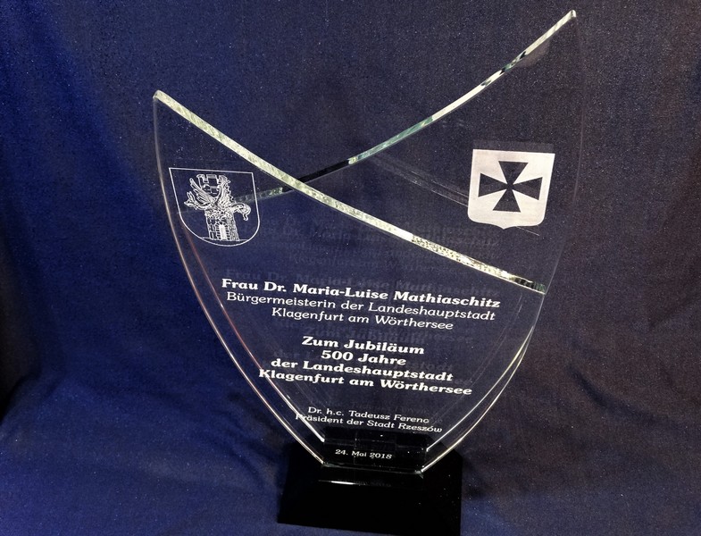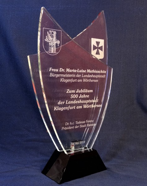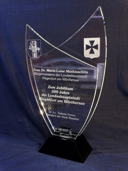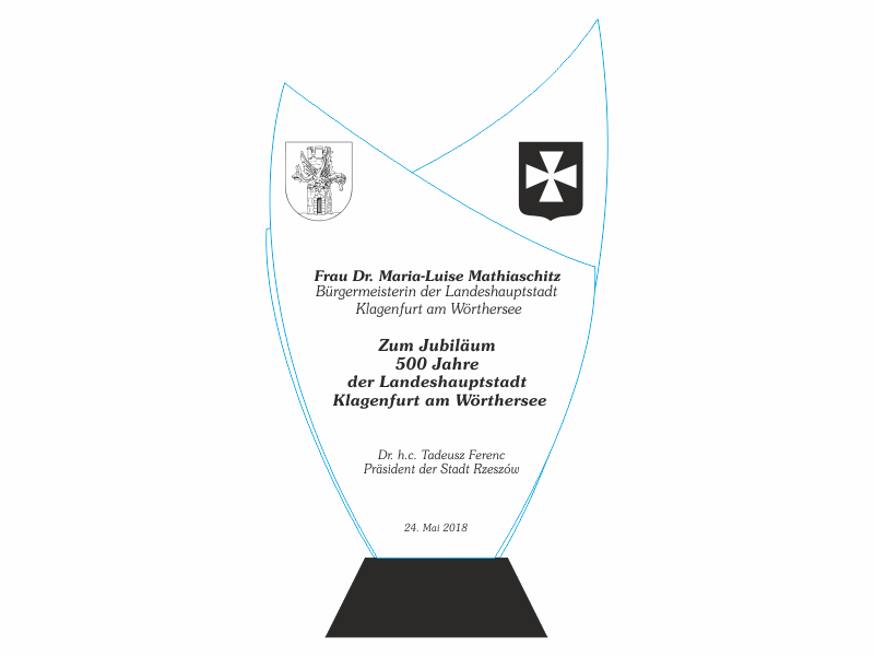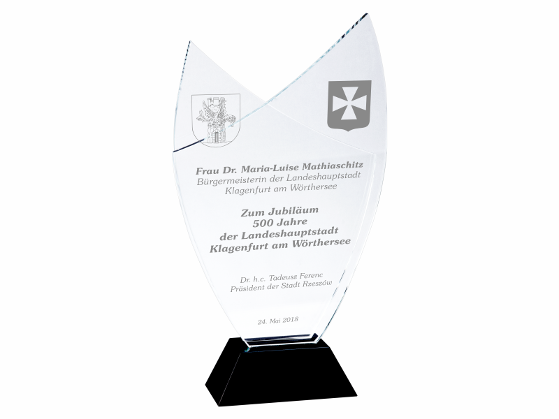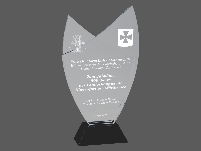 Grawer dedykacji i/lub logotypów wykonany jest na obu szklanych taflach statuetki.
