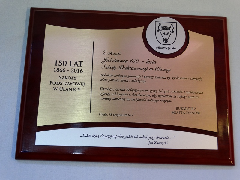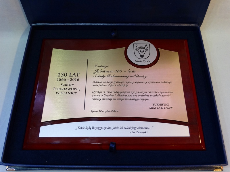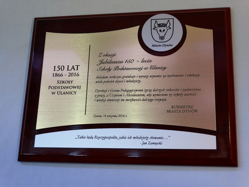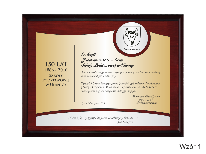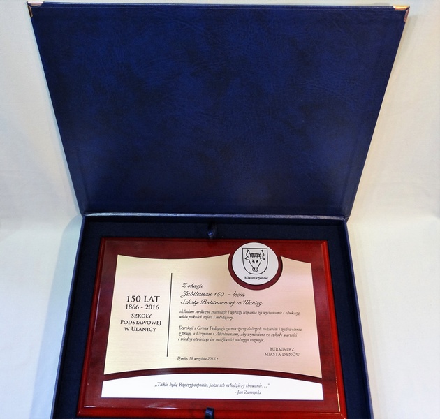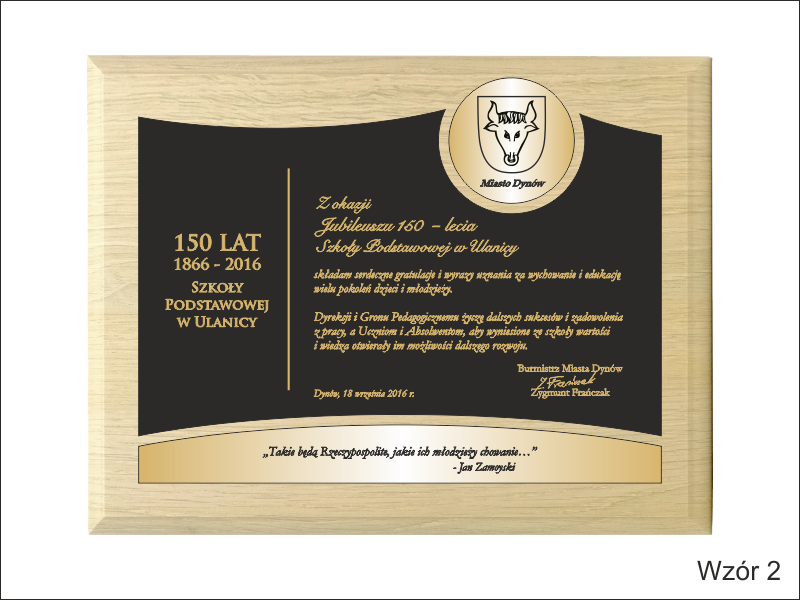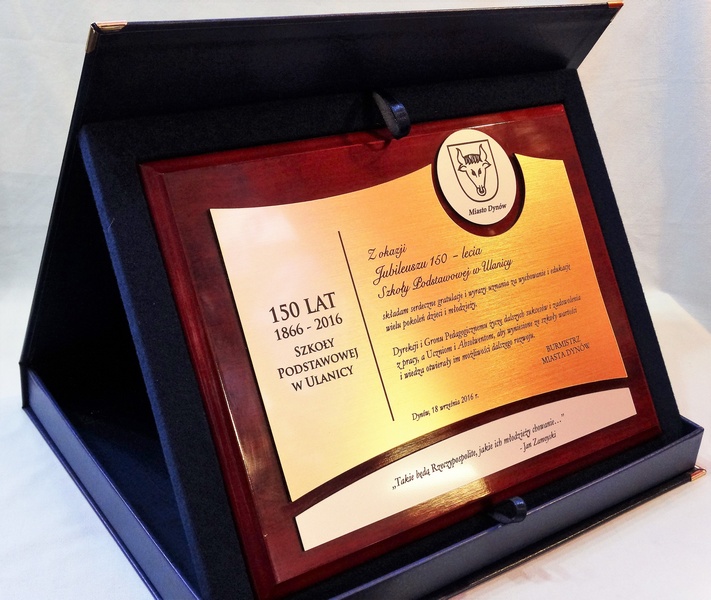 Pamiątkowy dyplom okolicznościowy na lakierowanym drewnianym podkładzie z okazji jubileuszu powstania szkoły, składający się: