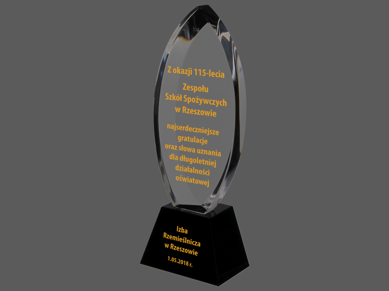 Pamiątkowa statuetka szklana C034 z grubego szlifowanego szkła z grawerem dedykacji z okazji Jubileuszu Szkoły.