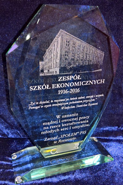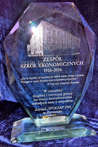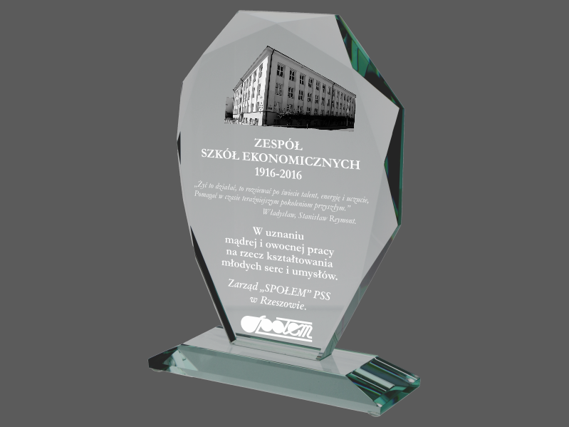 Pamiątkowa statuetka szklana G007 z grubego szlifowanego szkła z grawerem dedykacji z okazji Jubileuszu Szkoły.