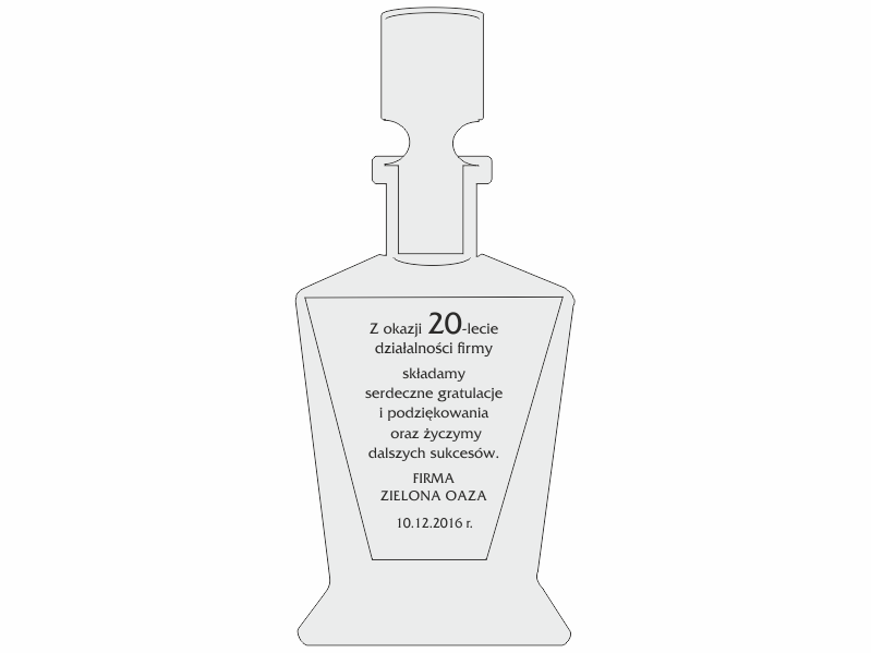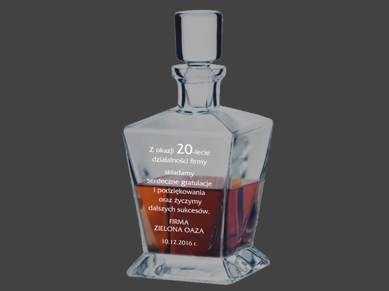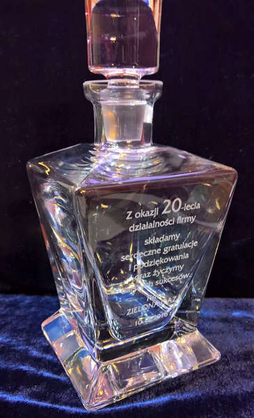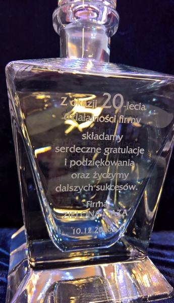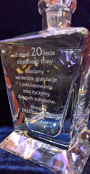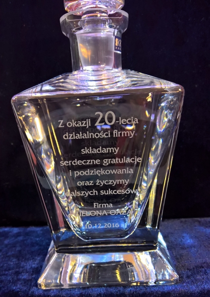 Na powierzchni karafki wykonujemy grawer dedykacji z okazji jubileuszu firmy.