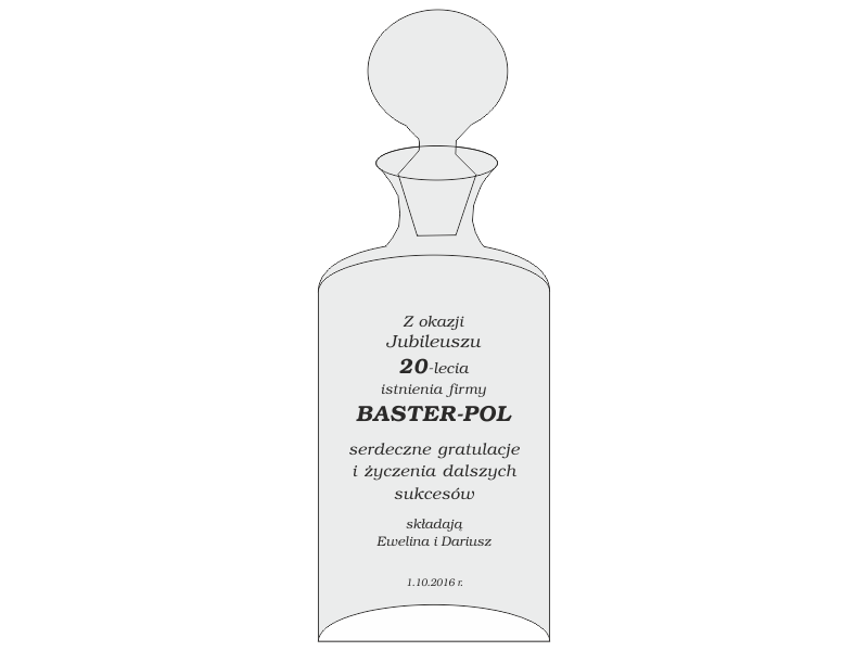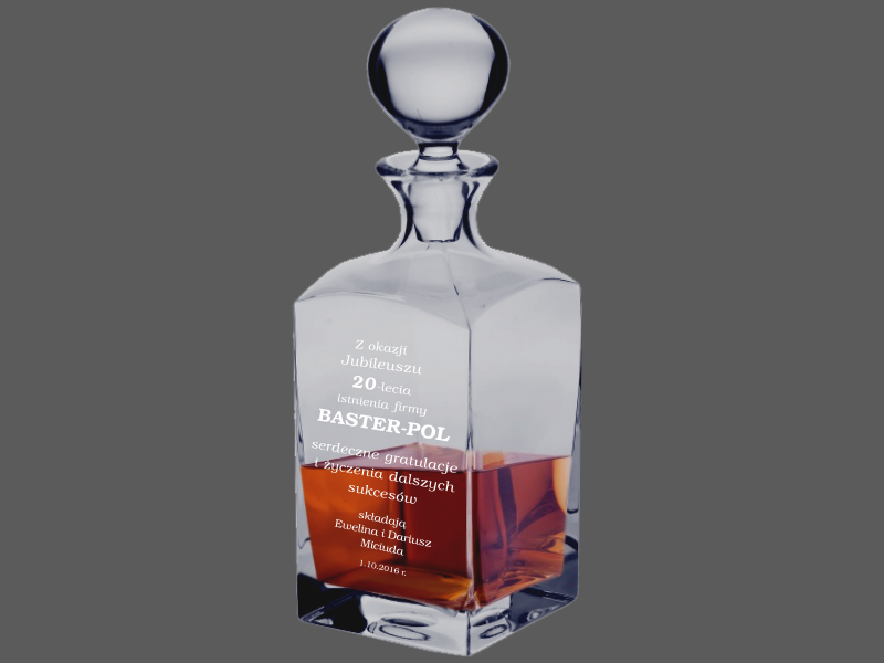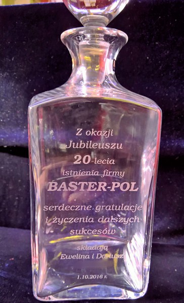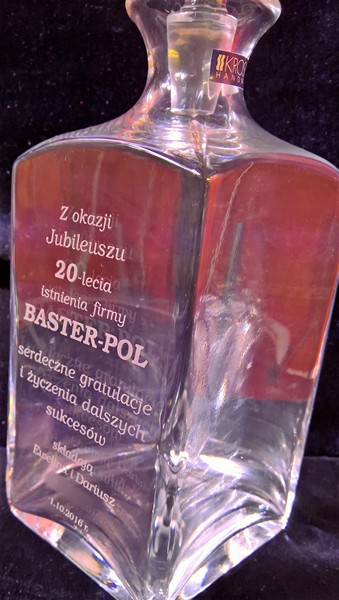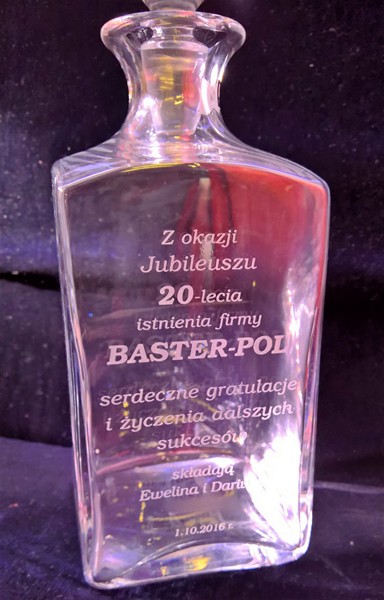 Na powierzchni karafki wykonujemy grawer dedykacji z okazji jubileuszu istnienia firmy.