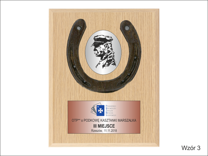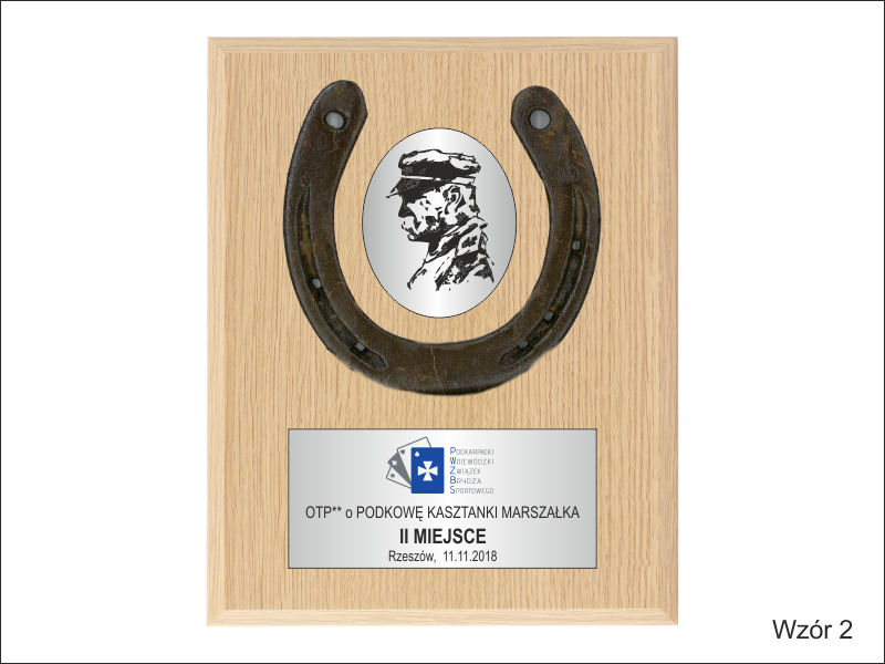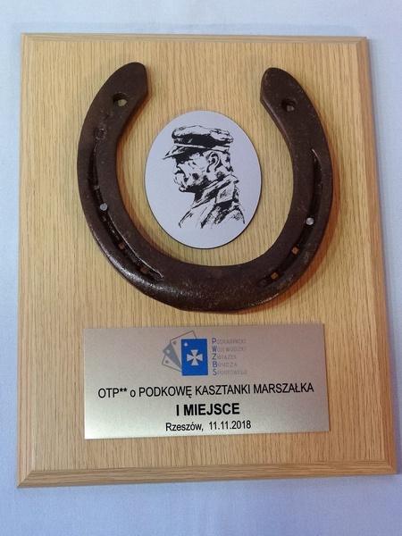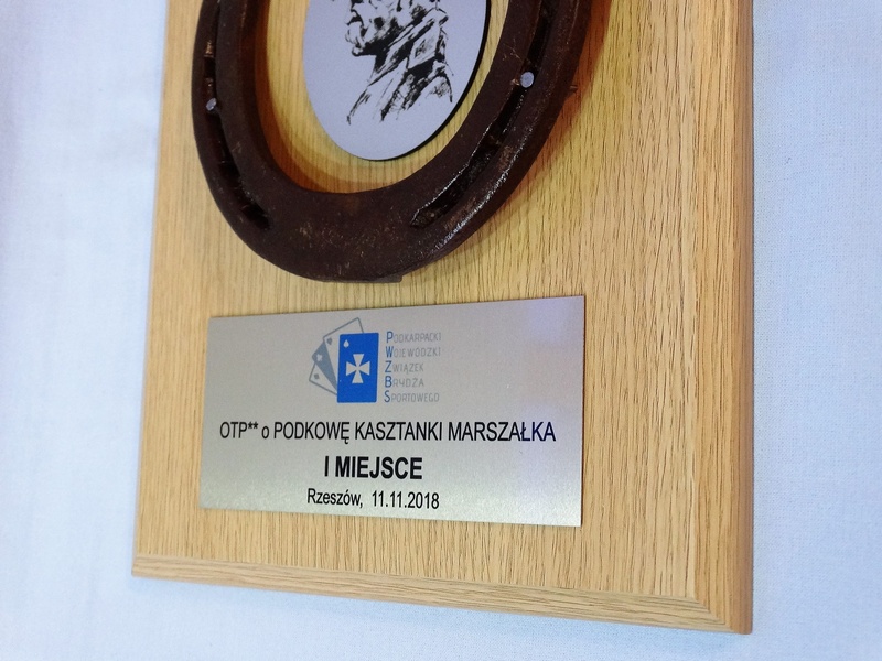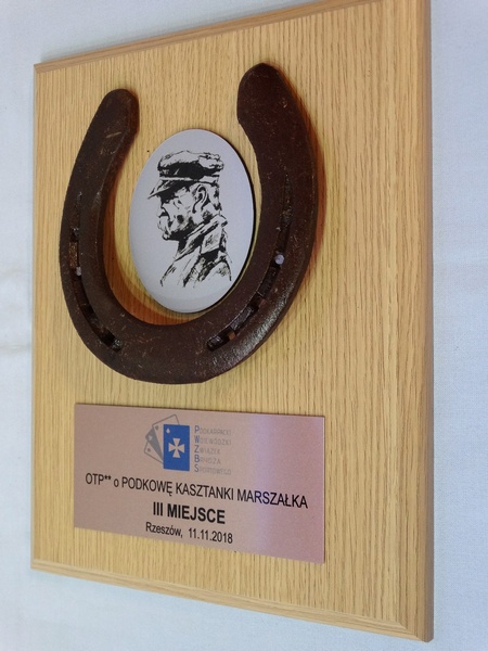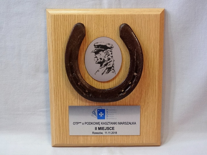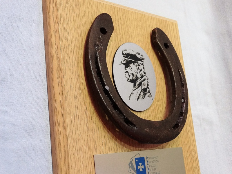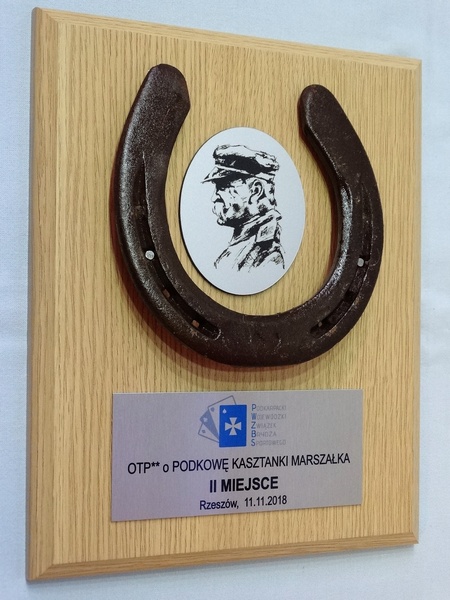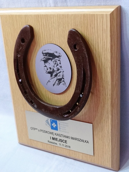 Nagroda w konkursie w formie złożonego dyplomu okolicznościowego na drewnianym podkładzie z podkową, składający się: