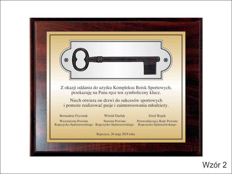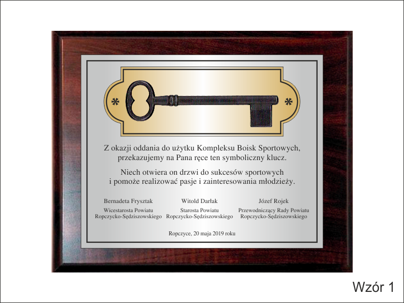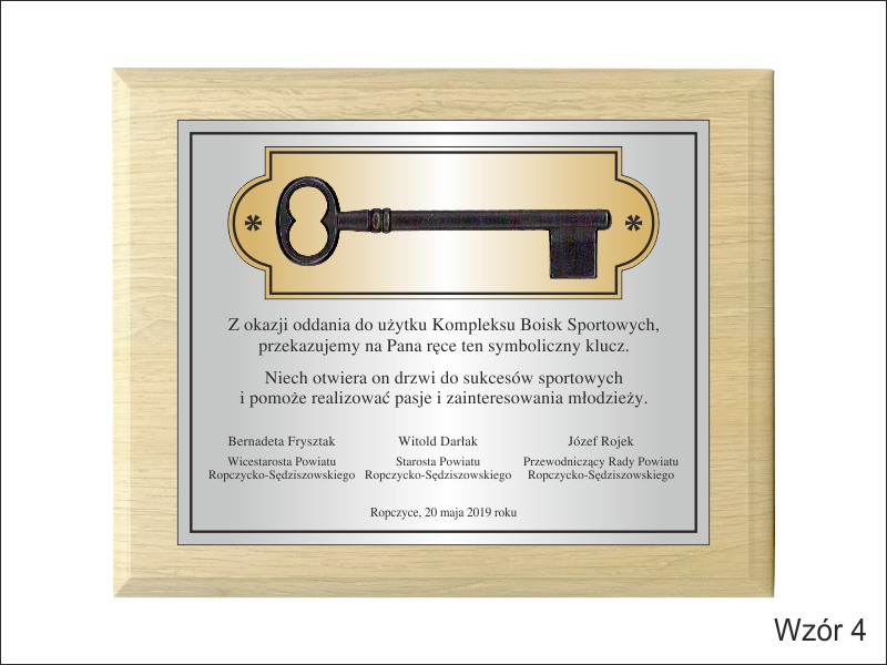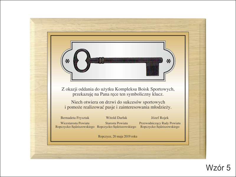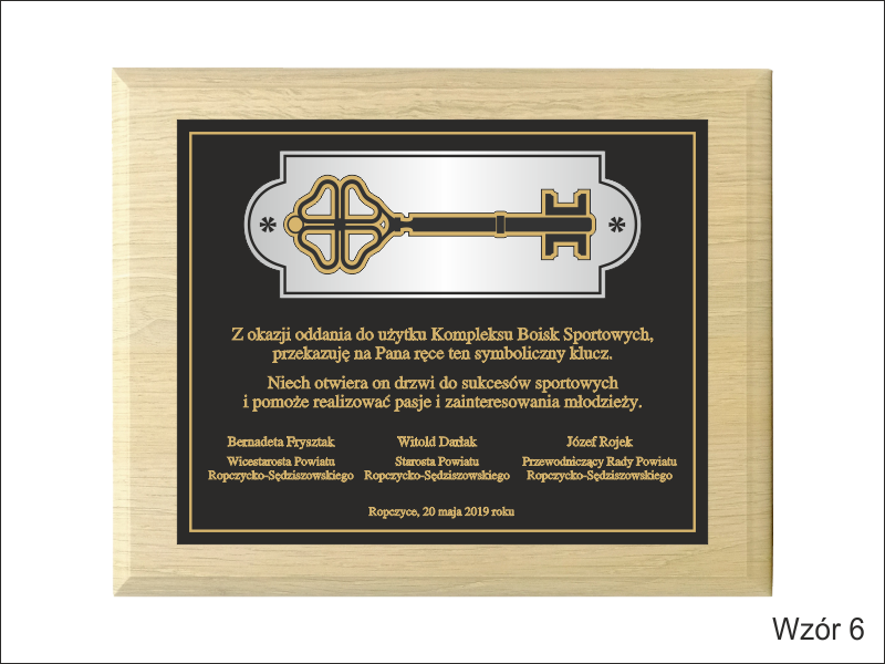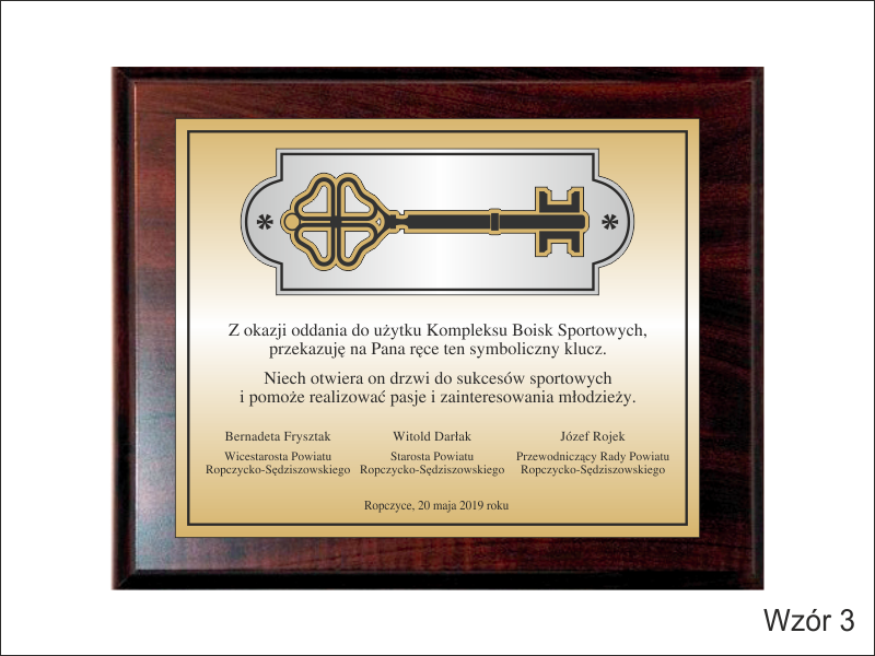 - z umocowanego na podkładce z laminatu klucza żeliwnego lub ozdobnej imitacji klucza wykonanej ze złotego laminatu