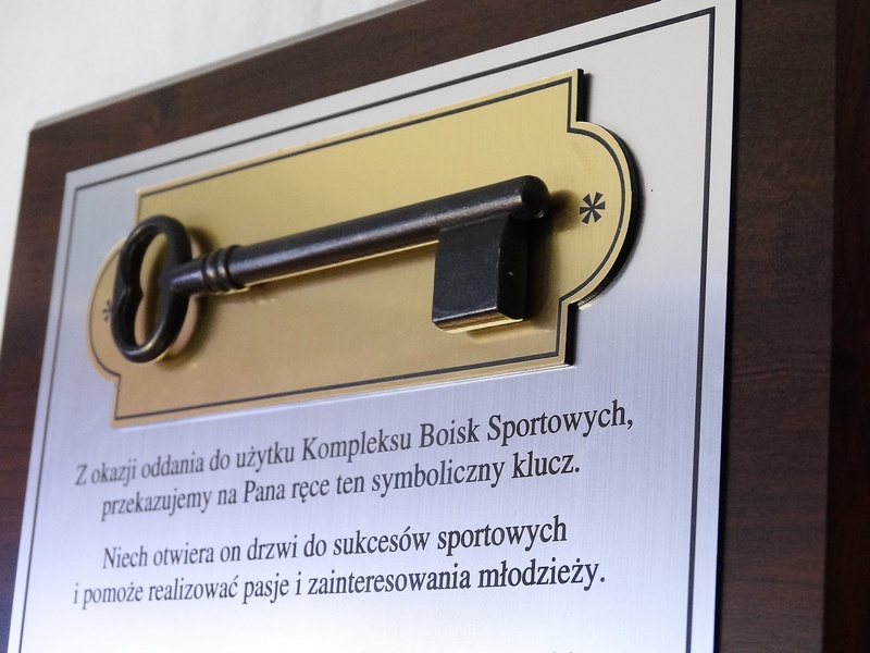 - z laminatów grawerskich (srebrnego, złotego, czarnego) z grawerowaną dedykacją,