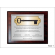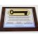 Pamiątkowy dyplom okolicznościowy zawierający symboliczny klucz z okazji otwarcia instytucji na drewnianym podkładzie.