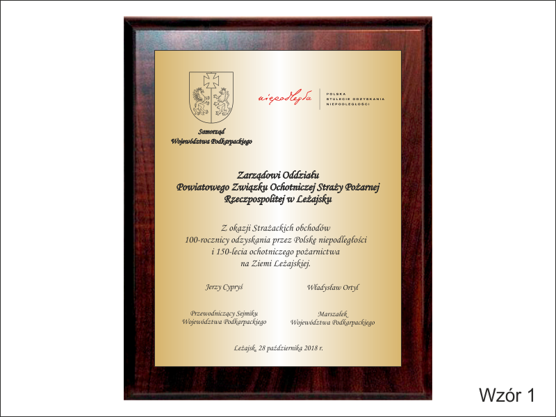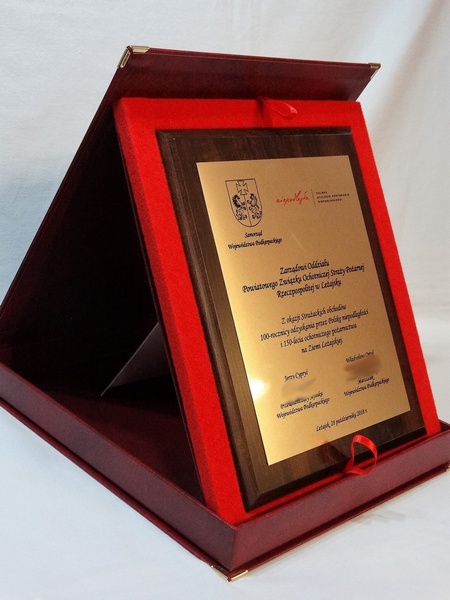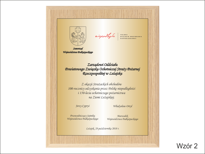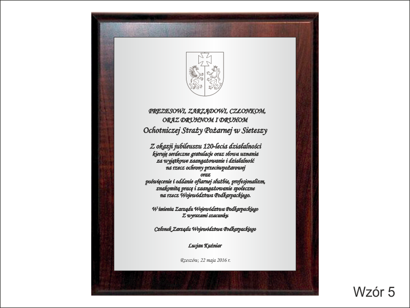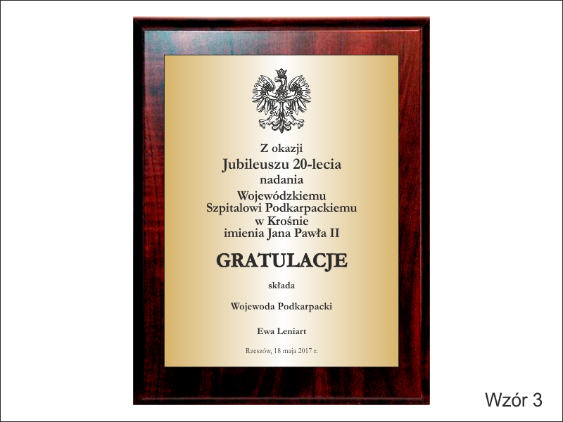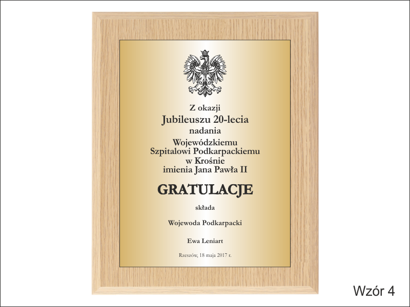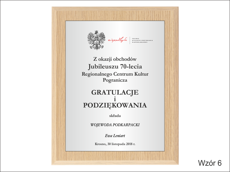 Urzędowa pamiątka w postaci dyplomu drewnianego pionowego na różne formalne i oficjalne okazje składający się z blachy z nadrukiem i podkładu.