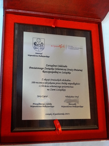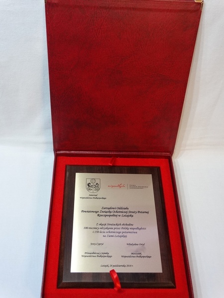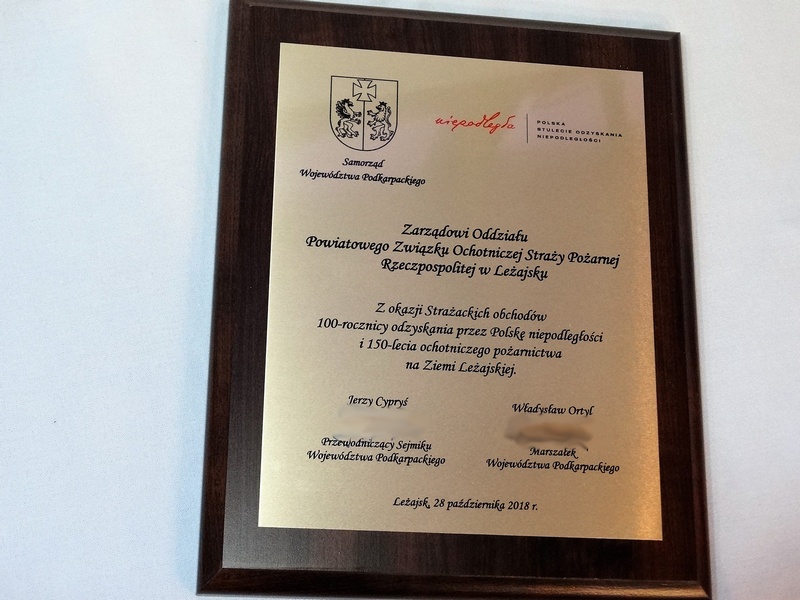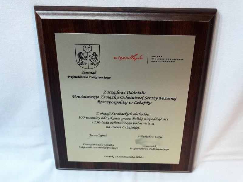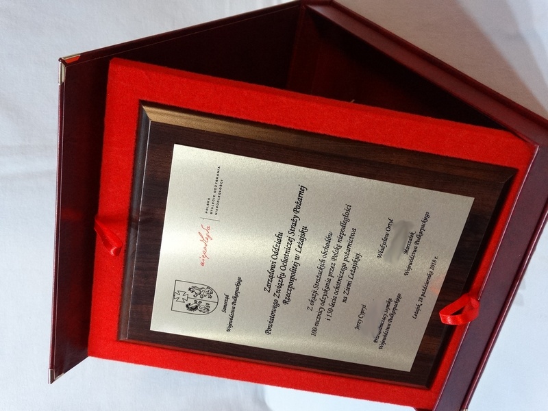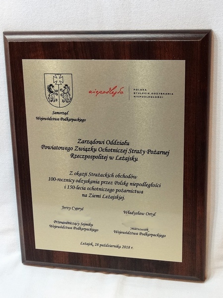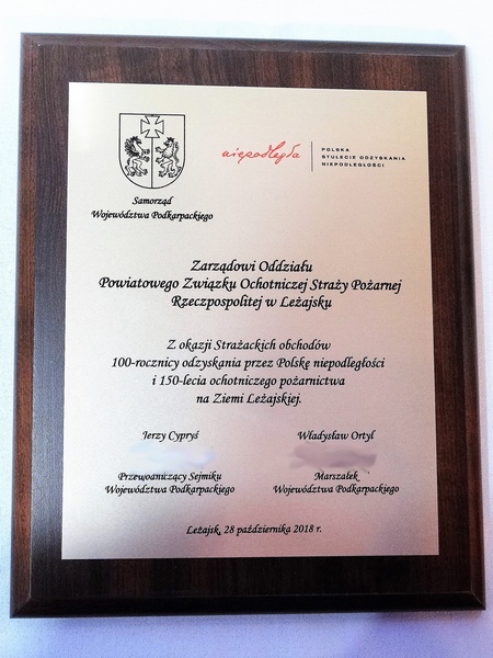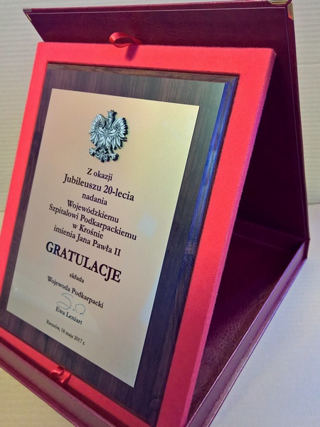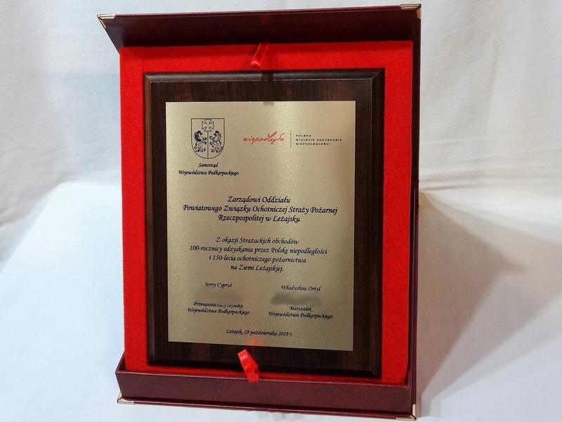 Urzędowa pamiątka w postaci dyplomu drewnianego pionowego na różne formalne i oficjalne okazje składający się z blachy z nadrukiem i podkładu.