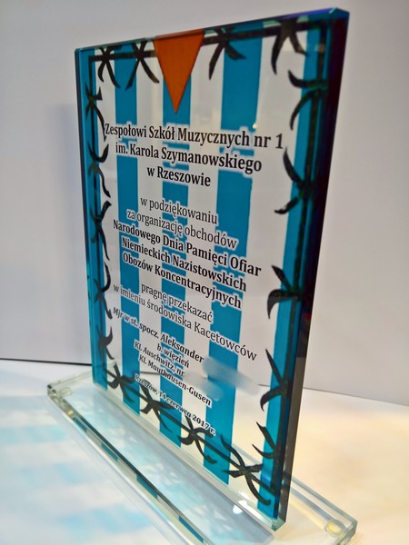 Statuetka ma kształt prostokąta osadzonego na podstawie. Na szkle wykonany jest nadruk dedykacji.