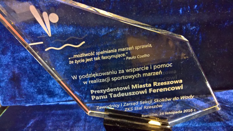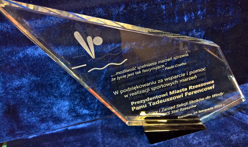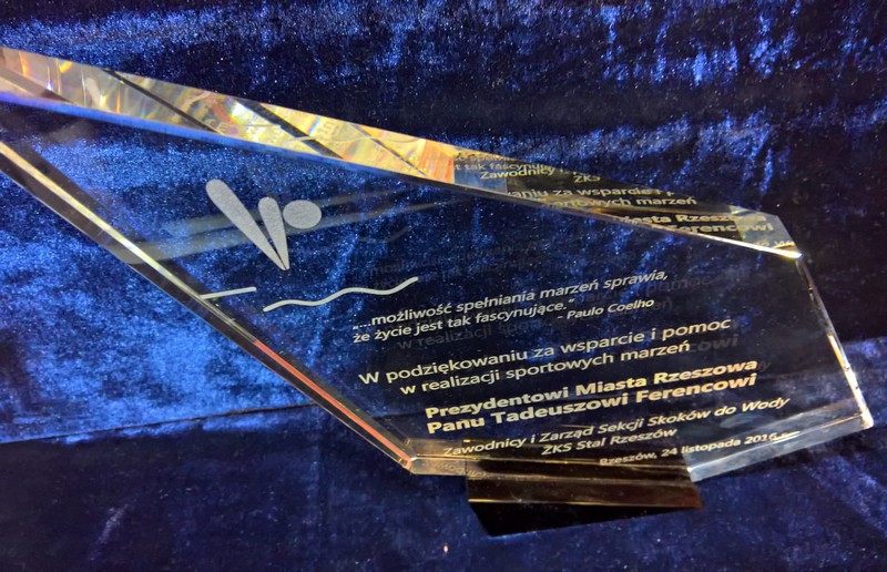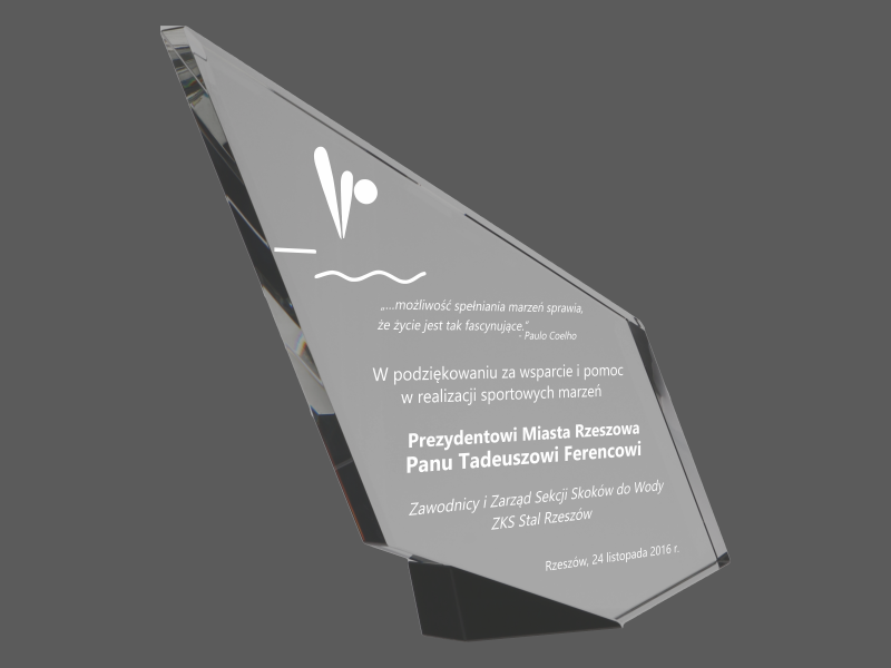 Statuetka ma wysokość 22 cm i grubość tafli szkła 20 mm.