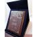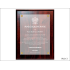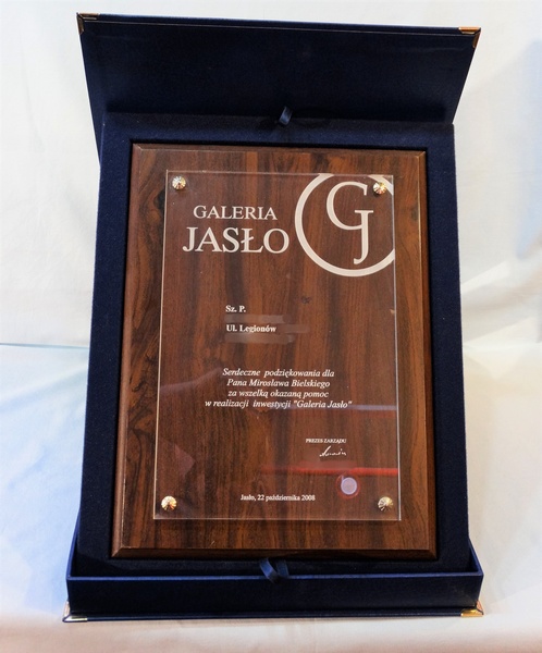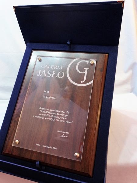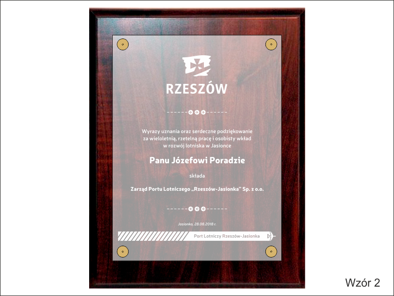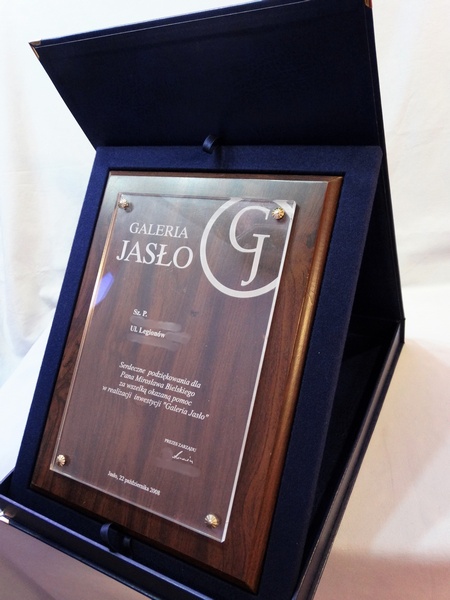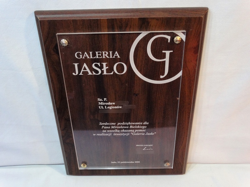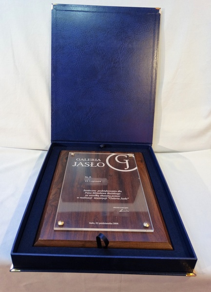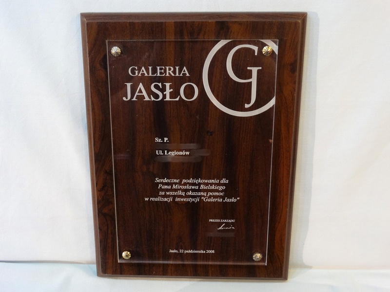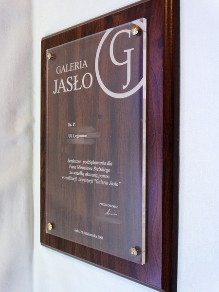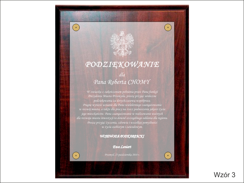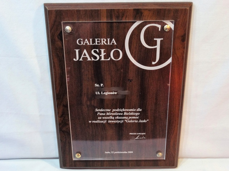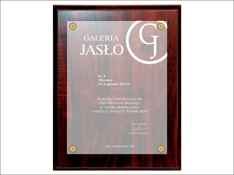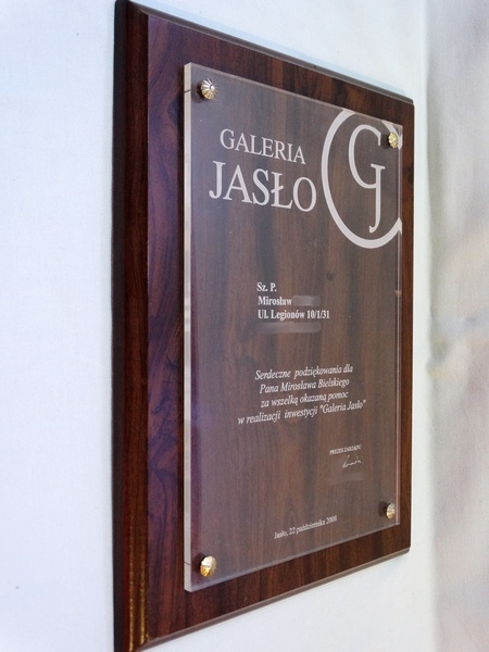 Podziękowanie za współpracę w formie drewnianego dyplomu wykonanego z grawerowanej bezbarwnej pleksy, mocowanej do podkładu ozdobnymi mosiądzowanymi gwoździami.