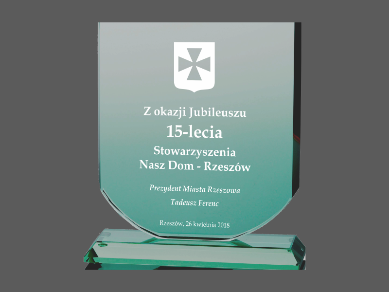 Statuetka szklana G001 z grubego szkła w kształcie tarczy herbowej z grawerem dedykacji i grafik z okazji Jubileuszu Stowarzyszenia.