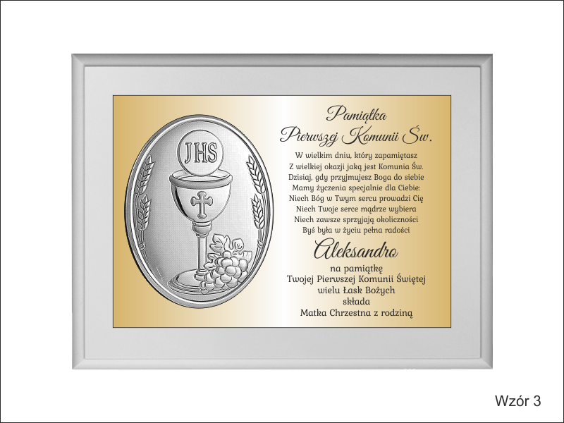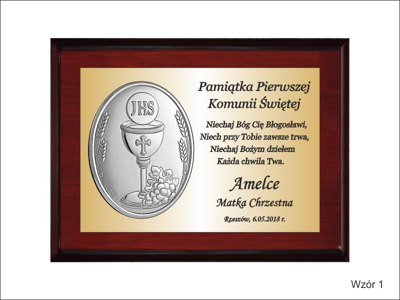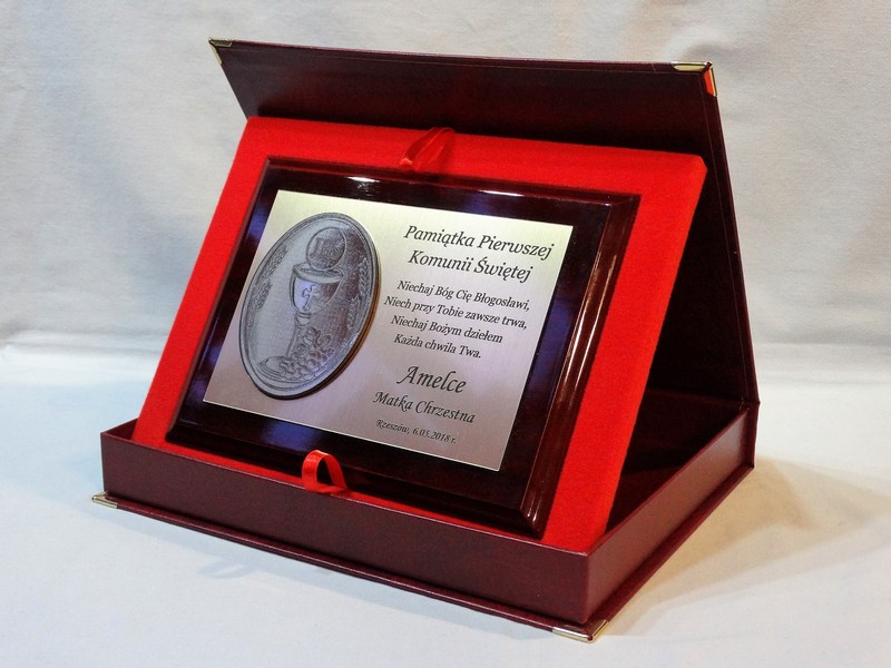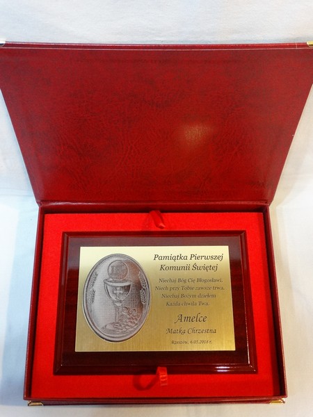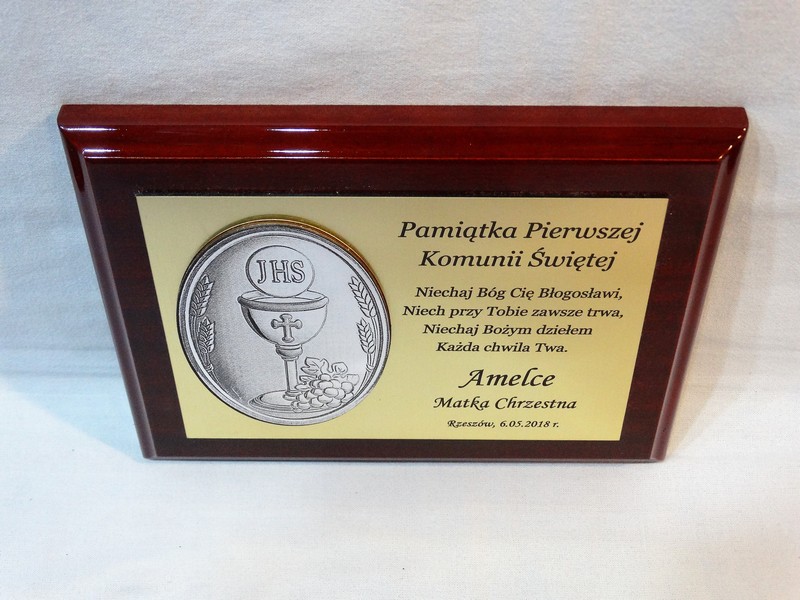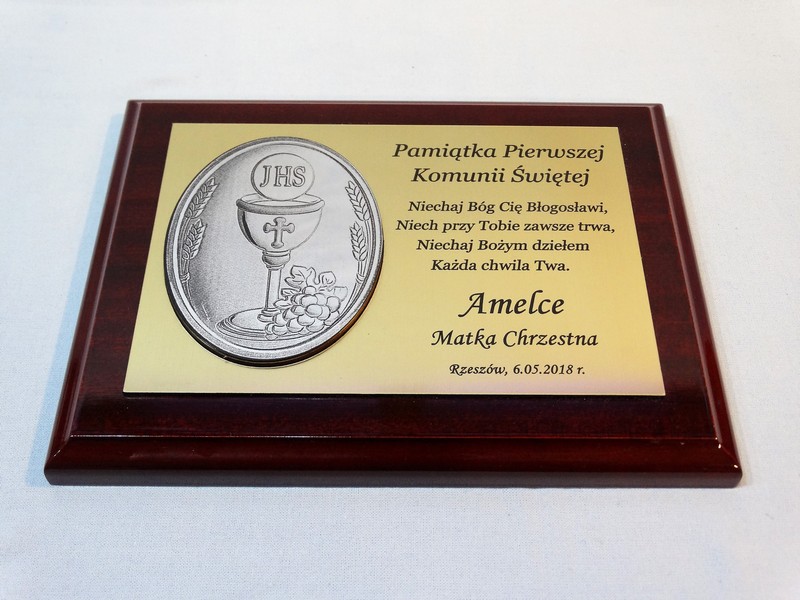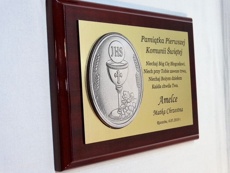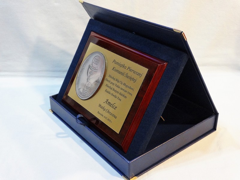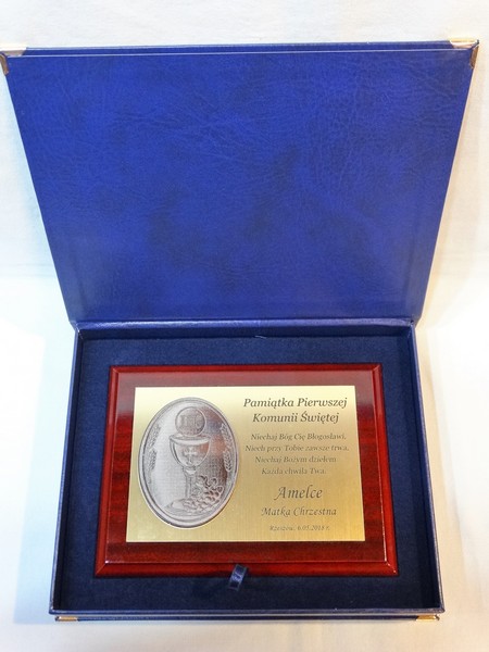 Wyjątkowa pamiątka z okazji I Komunii Św. w postaci dyplomu okolicznościowego na lakierowanym podkładzie.