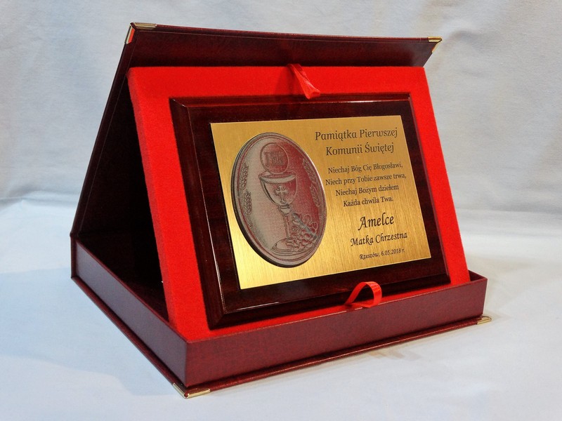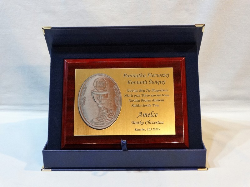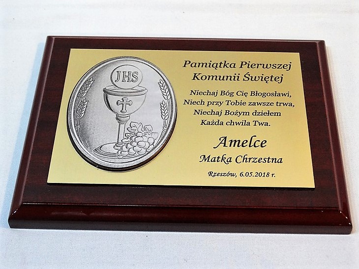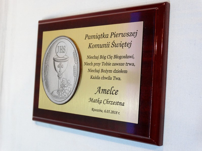 - z blachy lub laminatu z nadrukowaną lub grawerowaną dedykacją,