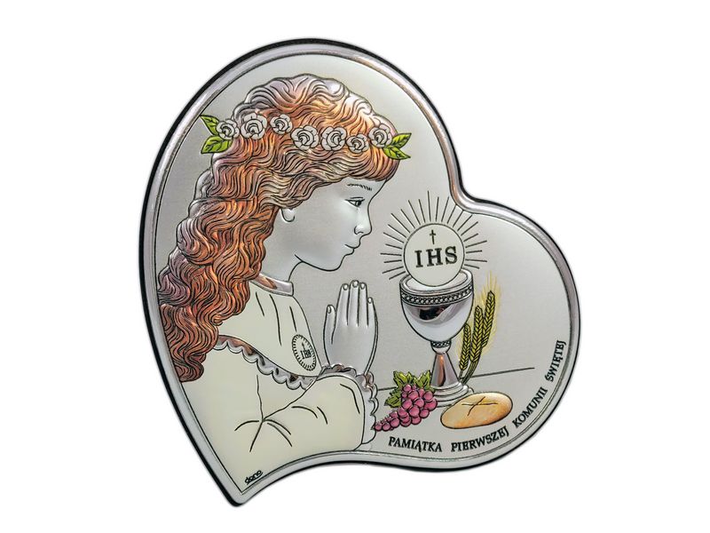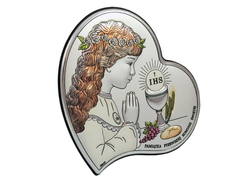 Srebrny obrazek DS03/CA w wersji z malowaniem ma kształt serca i przedstawia dziewczynkę, kielich i hostię.