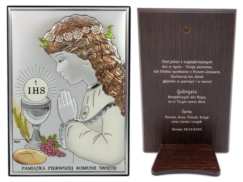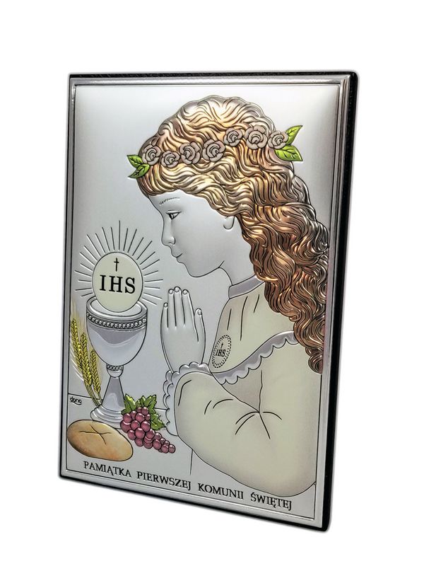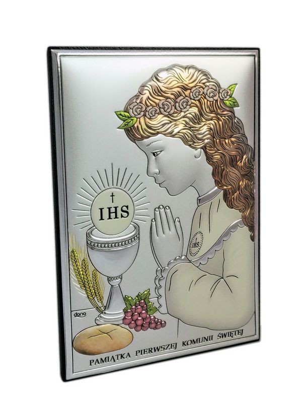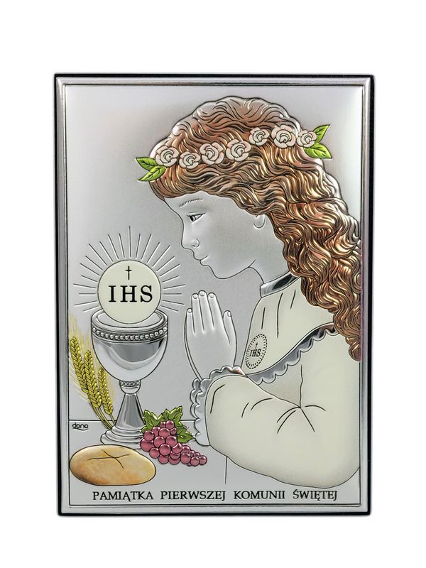 Srebrny obrazek DS04/CA w wersji z malowaniem ma prostokątny kształt i przedstawia wizerunek dziewczynki oraz kielich i Hostię.