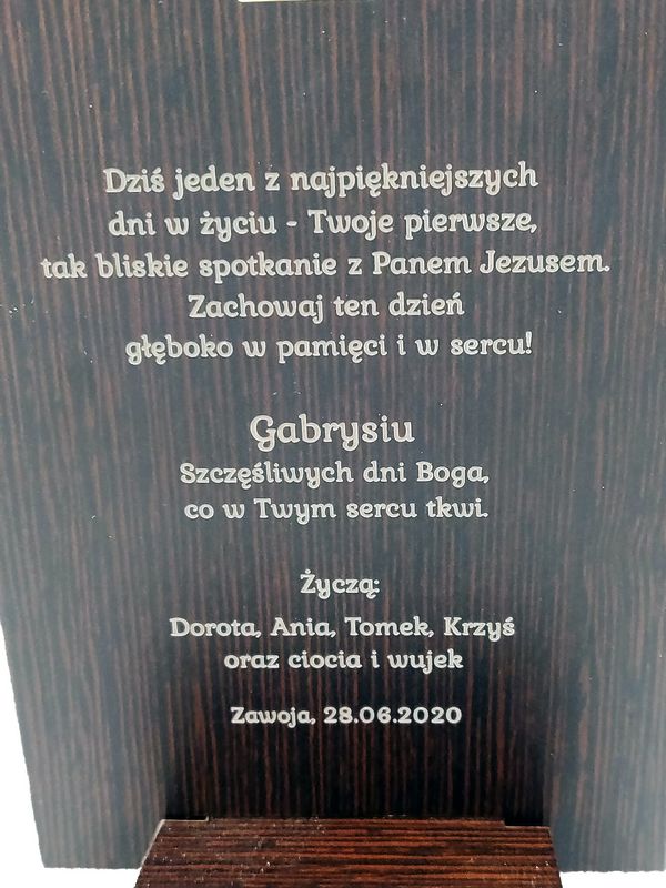 Na odwrocie obrazka można wygrawerować indywidualną pamiątkową dedykację z okazji przyjęcia I Komunii Św.