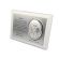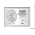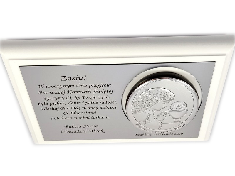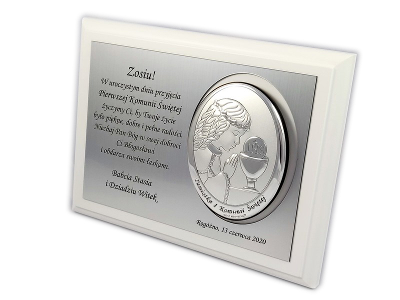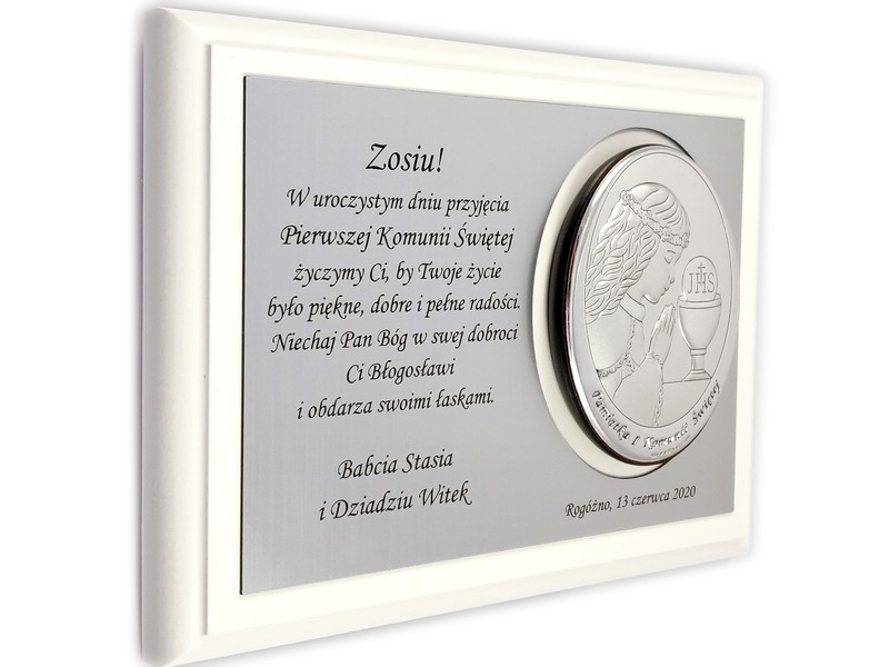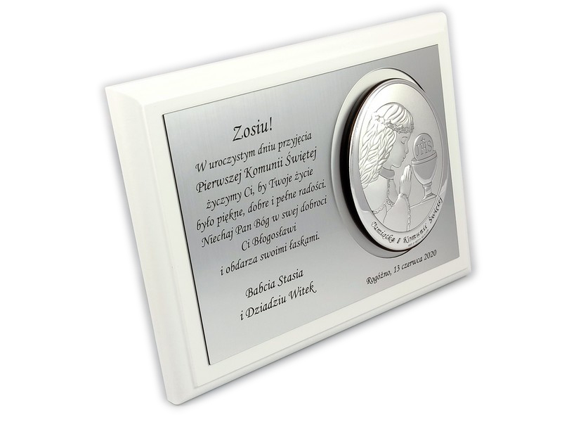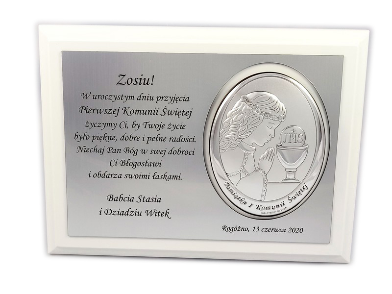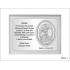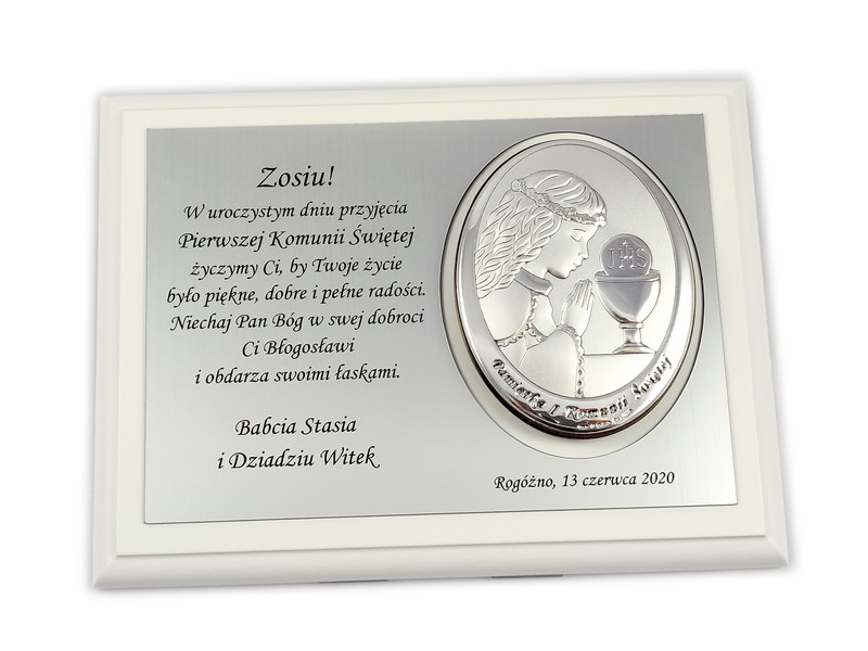 Upominek ma formę srebrnego obrazka umieszczonego razem ze srebrną tabliczką na drewnianym białym podkładzie.