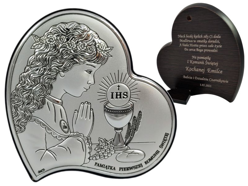 Pamiątka Pierwszej Komunii Świętej dla dziewczynki - srebrny obrazek w kształcie serca z grawerem.