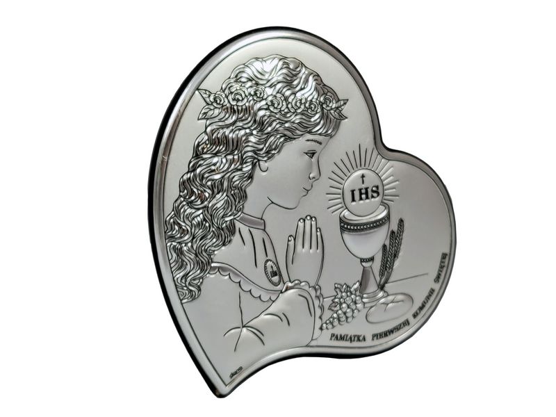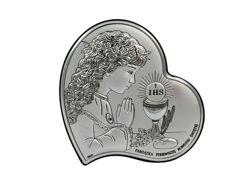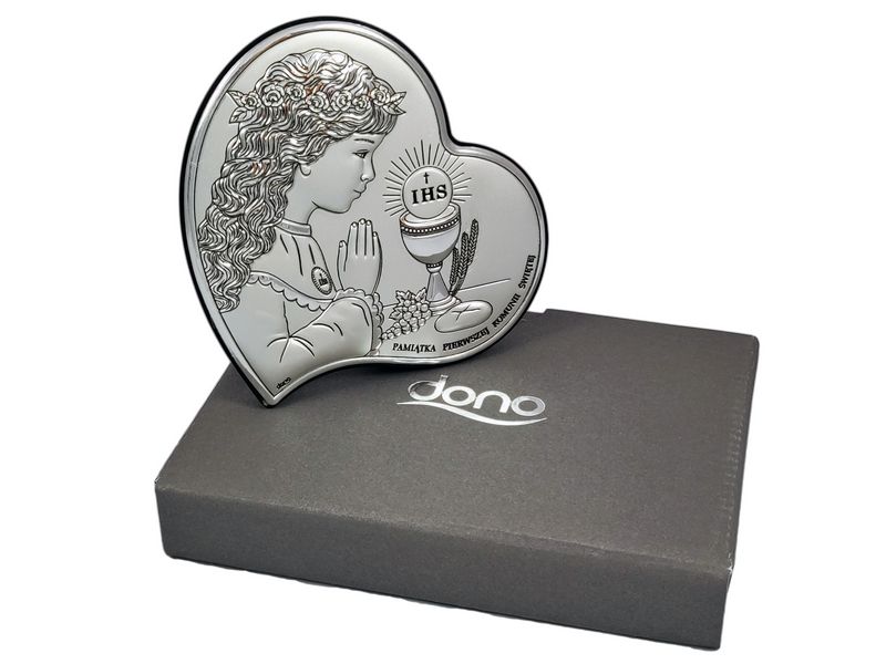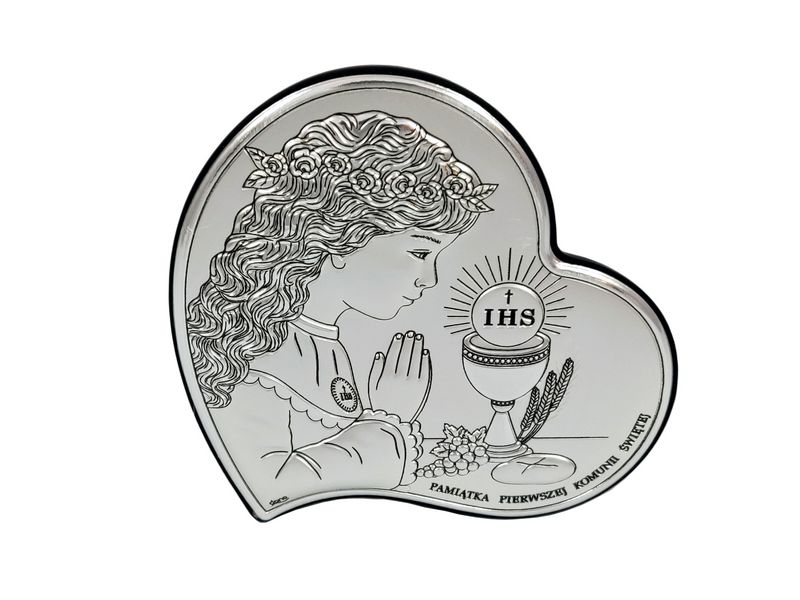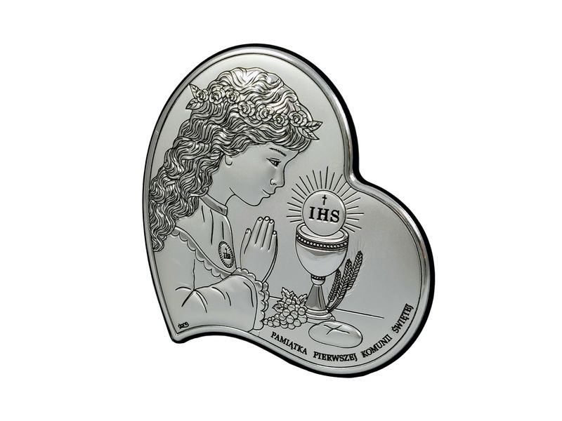 Srebrny obrazek DS03/A ma kształt serca i przedstawia dziewczynkę, kielich i hostię.