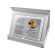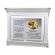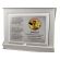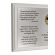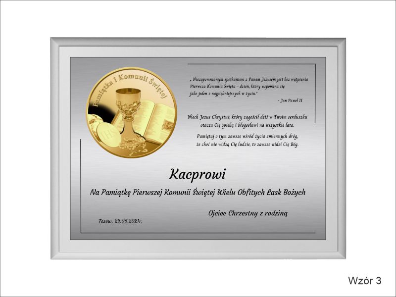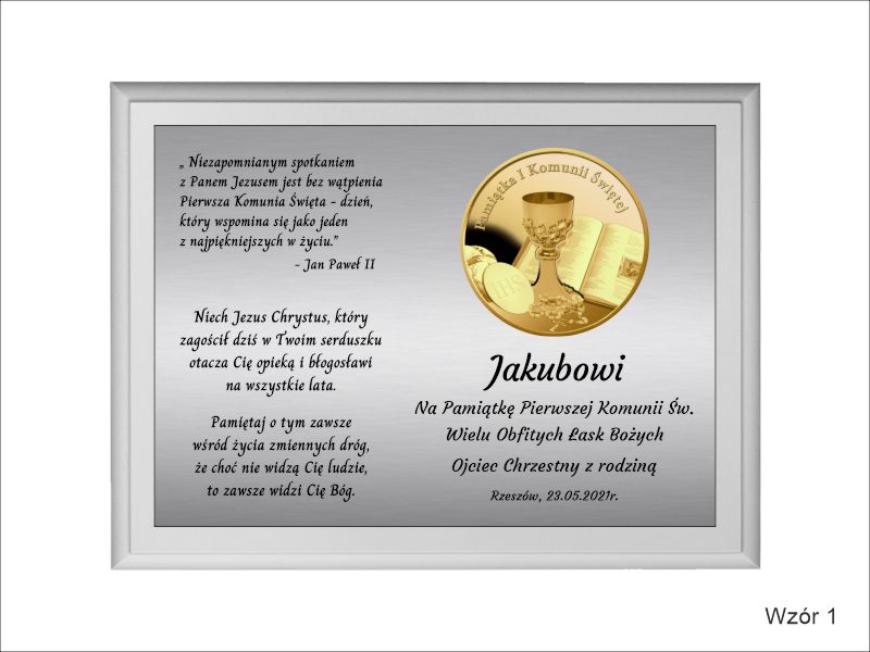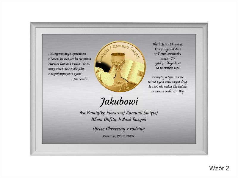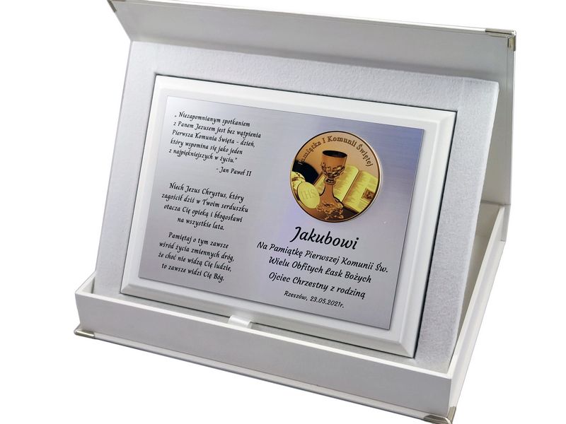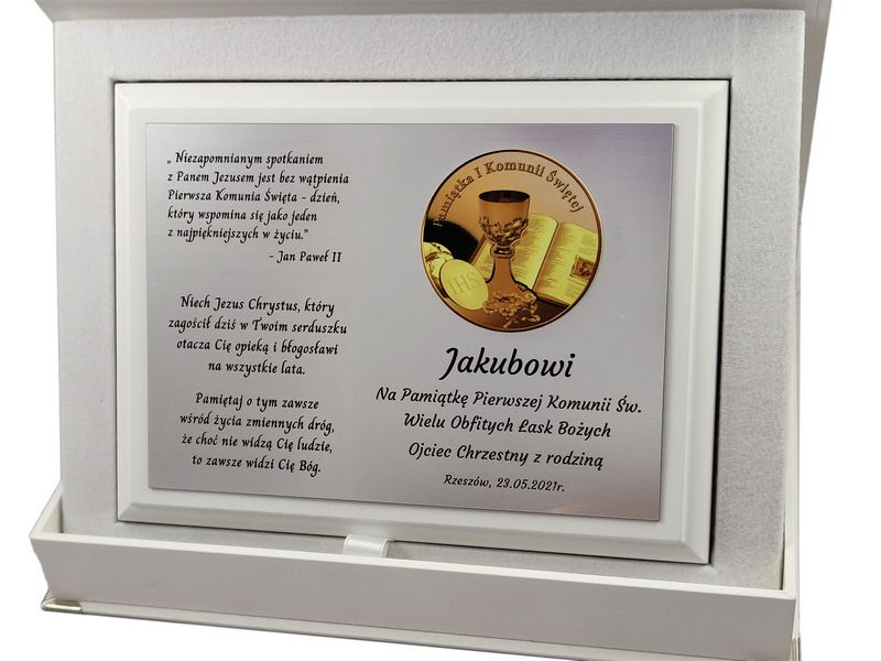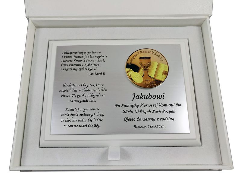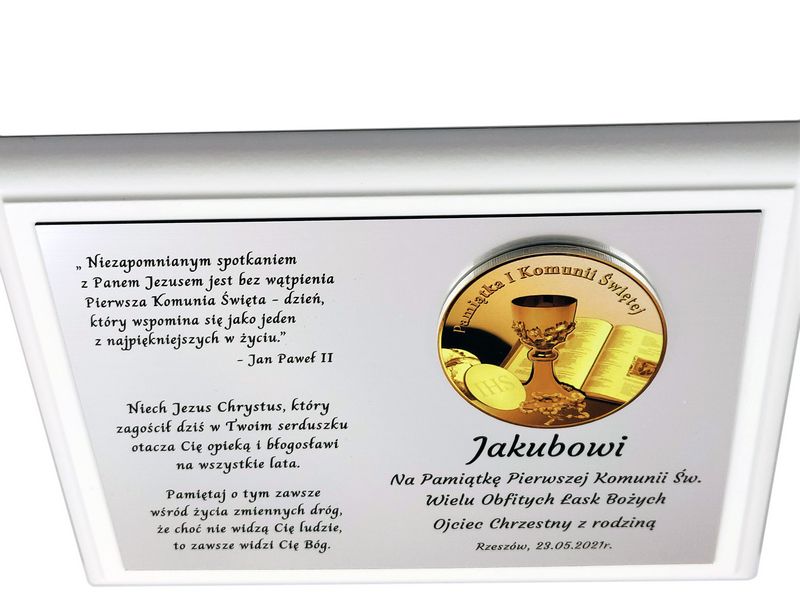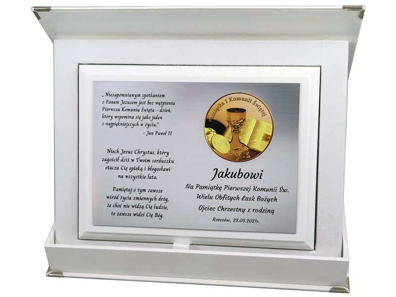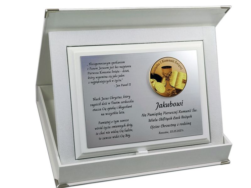Pamiątkowa dedykacja komunijna jest wygrawerowana w srebrnym laminacie, na którym umieszczony jest także ozdobny emblemat z okolicznościową grafiką i napisem "Pamiątka I Komunii Świętej". Emblemat nadrukowany jest na białej pleksie.
