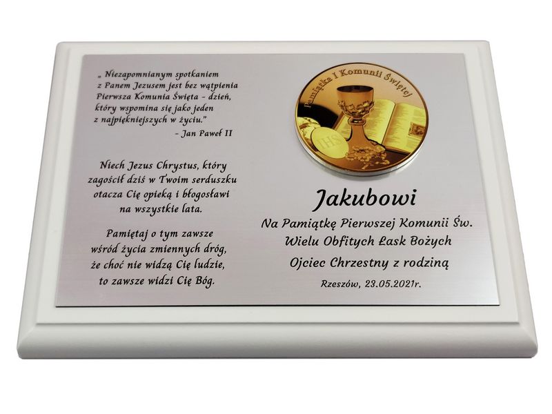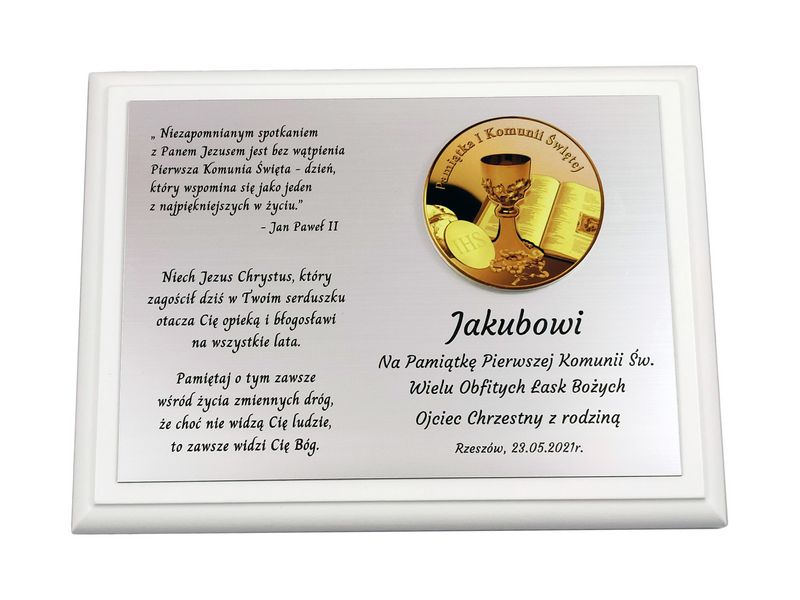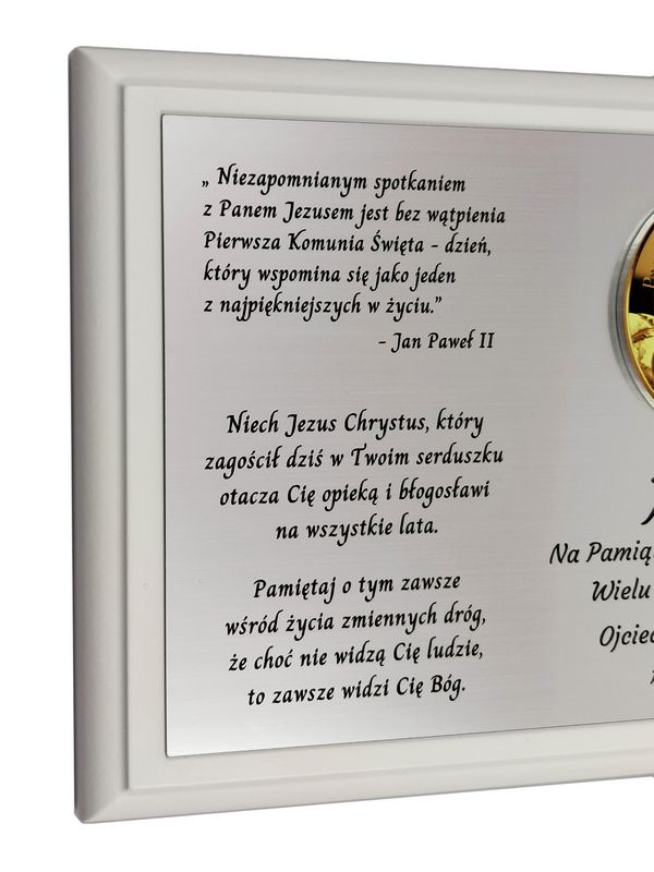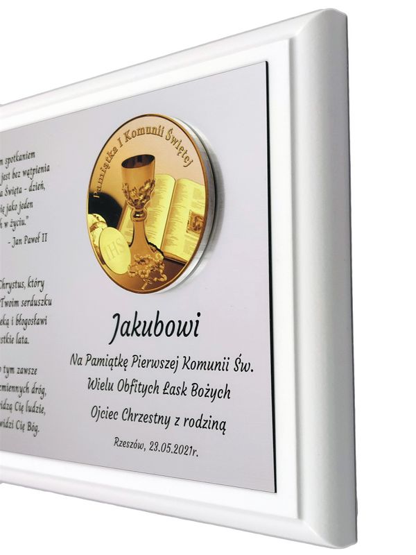 Biały drewniany dyplom z grawerem będzie wyjątkowym prezentem na pamiątkę przyjęcia Pierwszej Komunii Świętej.