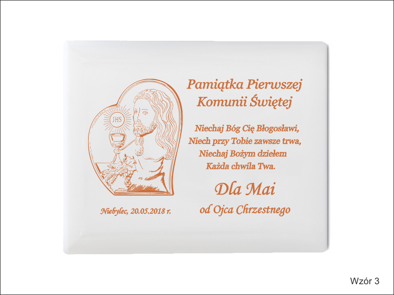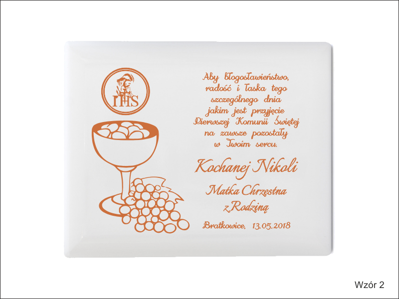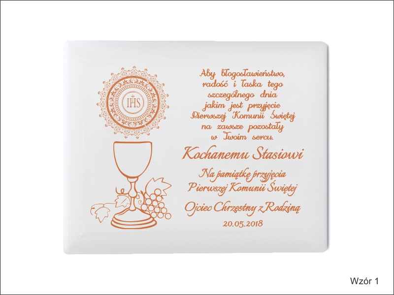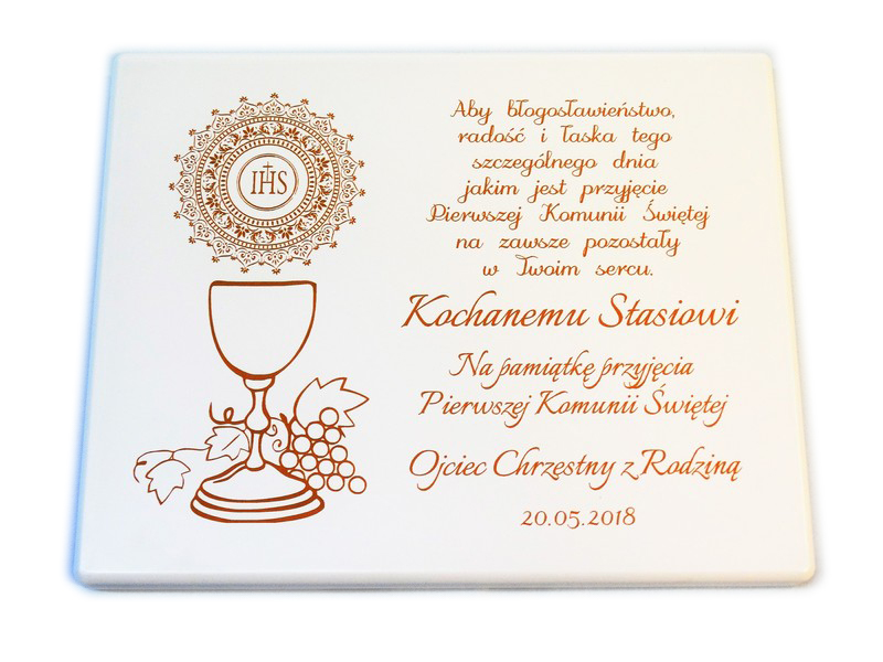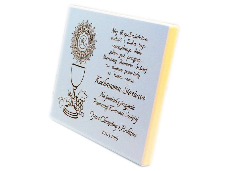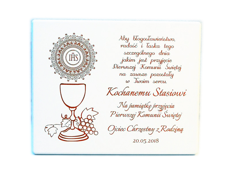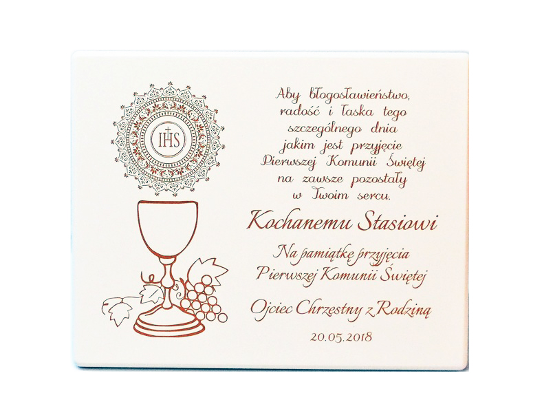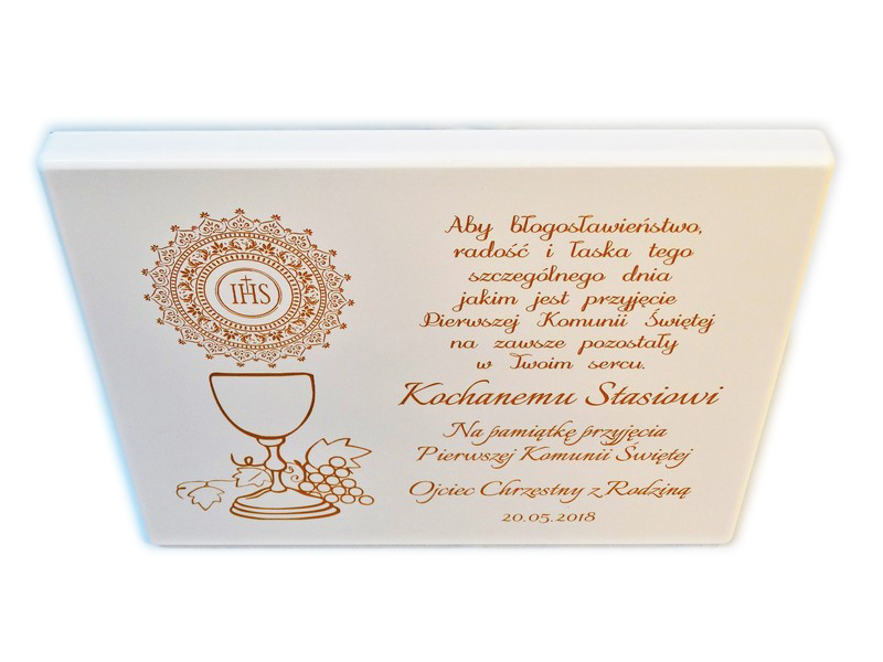 Dedykacja oraz ozdobne grafiki z motywem komunijnym są wygrawerowane bezpośrednio na podkładzie w poziomym układzie.