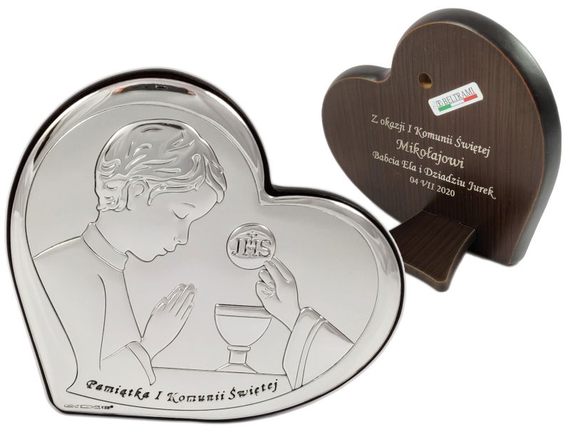 Upominek z okazji przyjęcia Pierwszej Komunii Świętej dla chłopczyka w postaci srebrnego obrazka z grawerem.