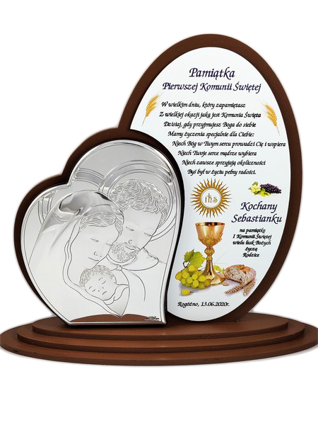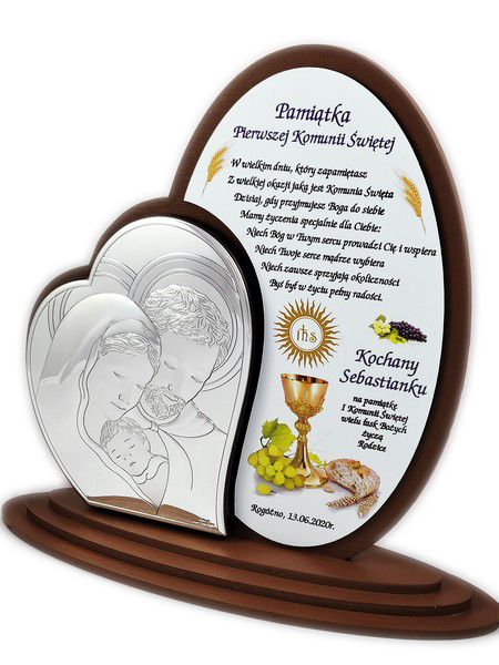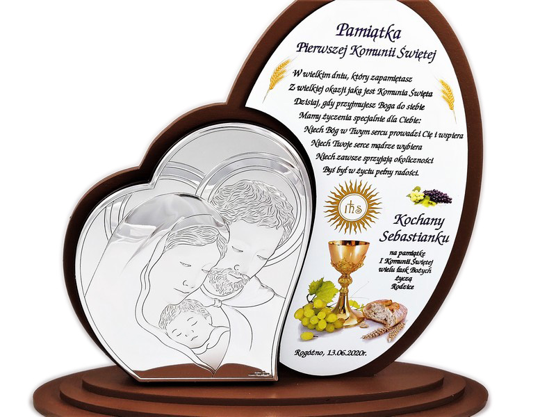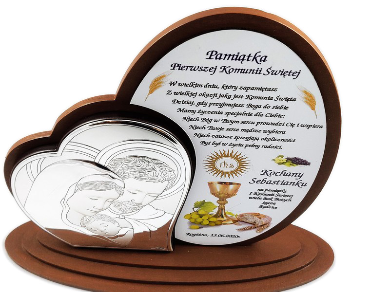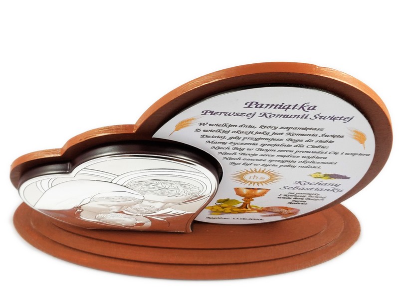 Wyjątkowy upominek na pamiątkę przyjęcia I Komunii Świętej w formie srebrnego obrazka umieszczonego na statuetce drewnianej.