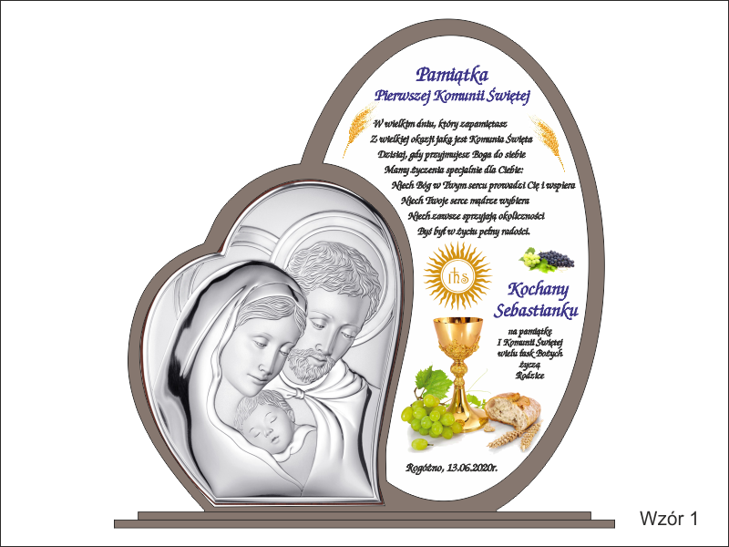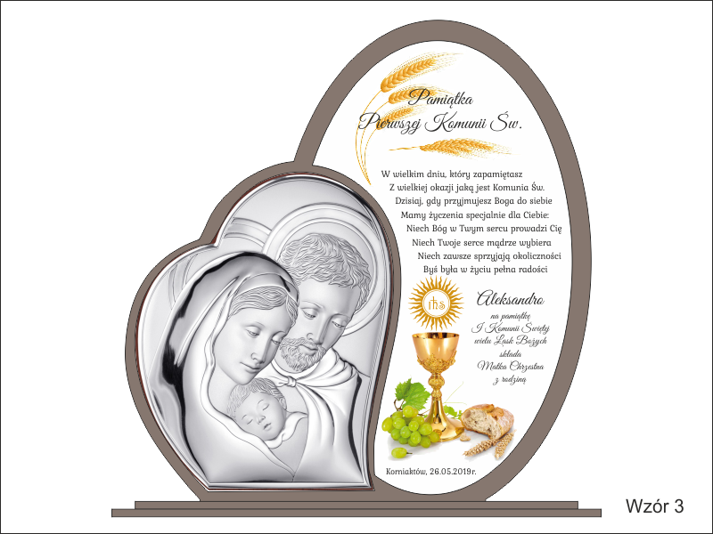W projekcie pamiątki wykorzystano tematykę Świętej Rodziny oraz kielicha z Hostią.