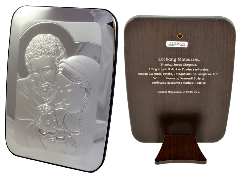 Pamiątkowy upominek z okazji przyjęcia Pierwszej Komunii Świętej w postaci srebrnego obrazka ze Św. Rodziną z grawerem.