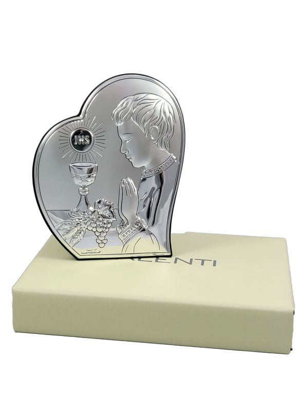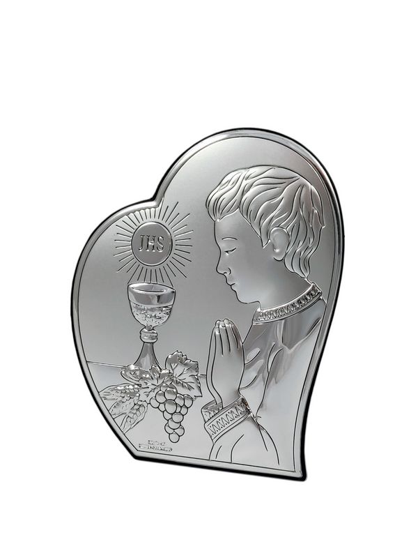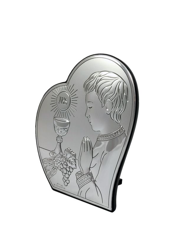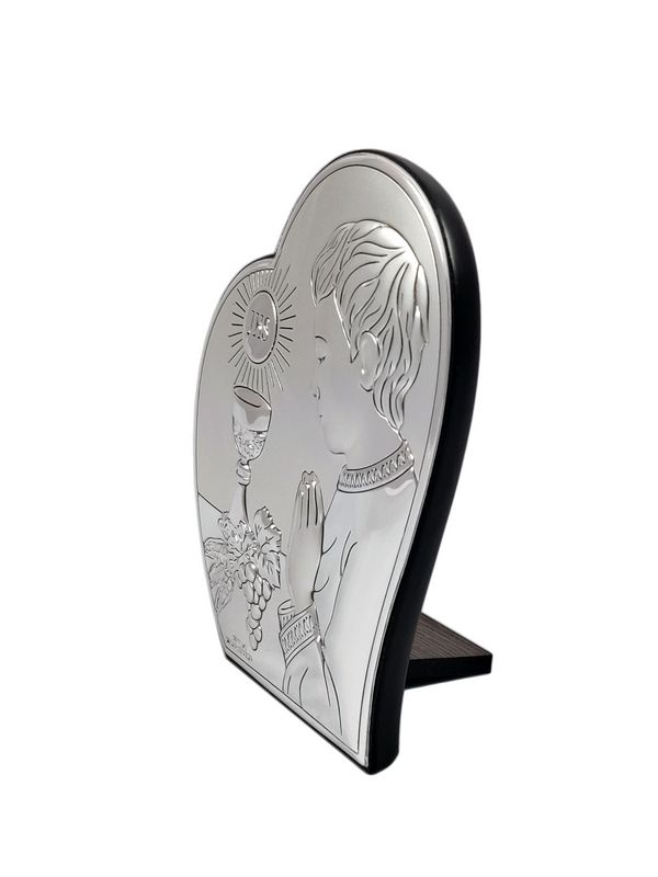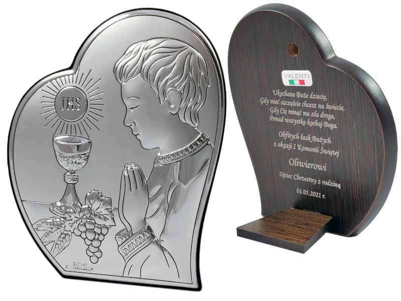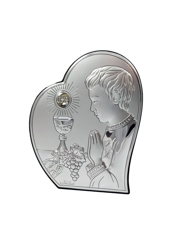 Upominek na pamiątkę przyjęcia Pierwszej Komunii Świętej dla chłopczyka w postaci srebrnego obrazka z grawerem.