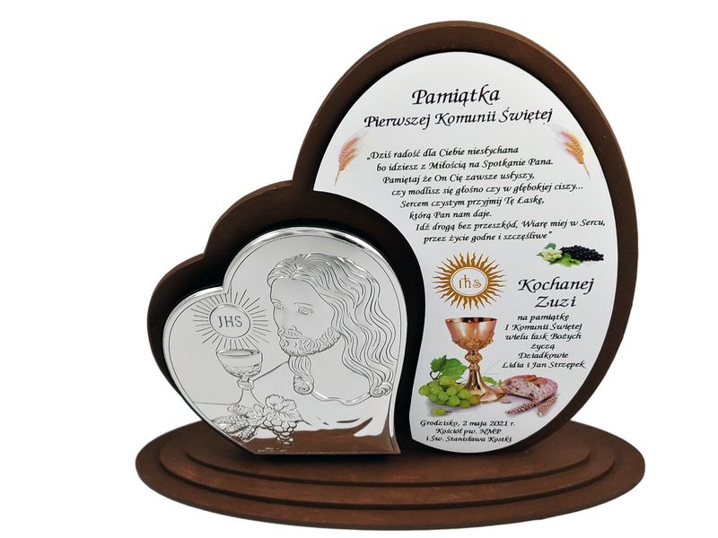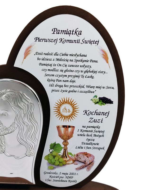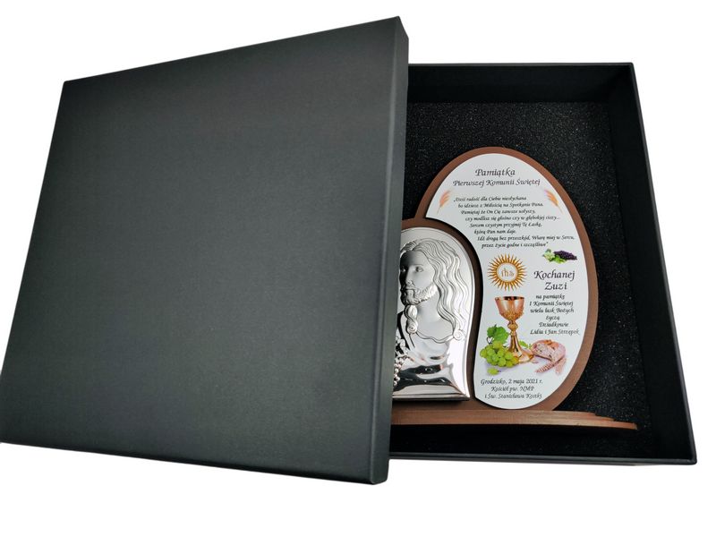 Wyjątkowy prezent na pamiątkę I Komunii Świętej w postaci drewnianej statuetki ze srebrym obrazkiem z wizerunkiem Jezusa.