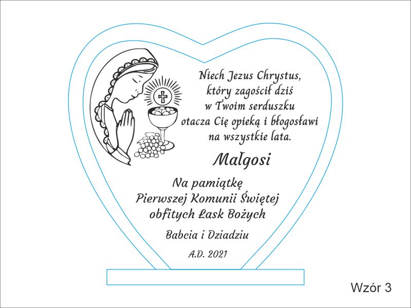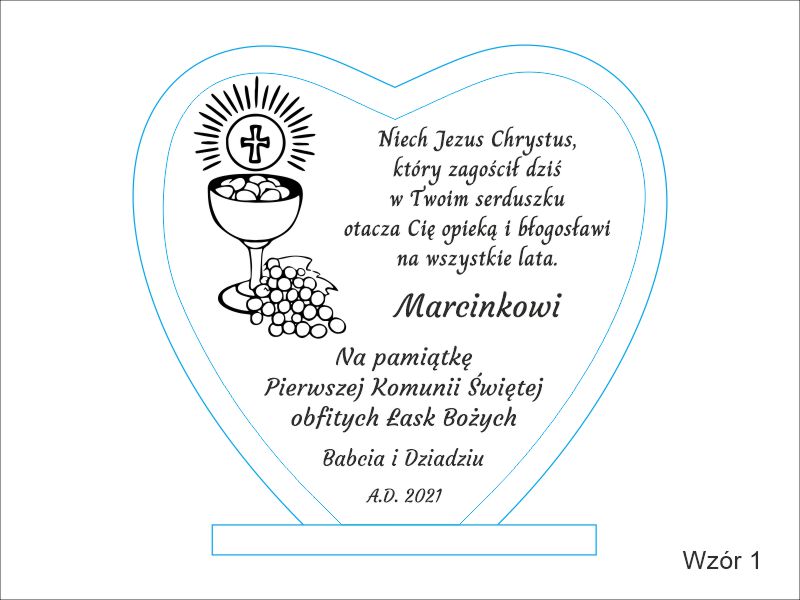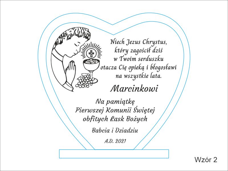 Na statuetce wykonany jest grawer ozdobnych grafik i dedykacji na pamiątkę I Komunii Św.