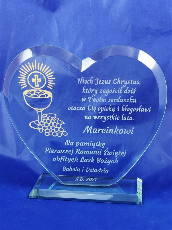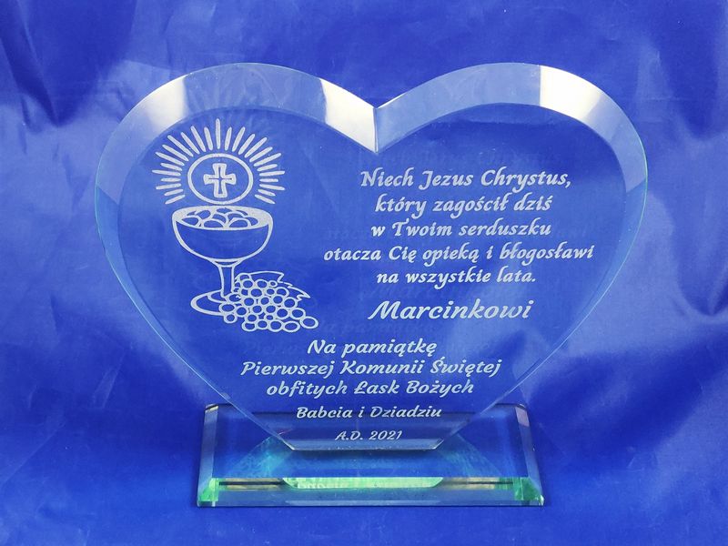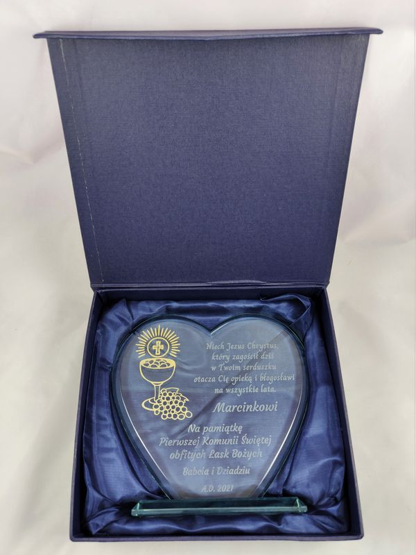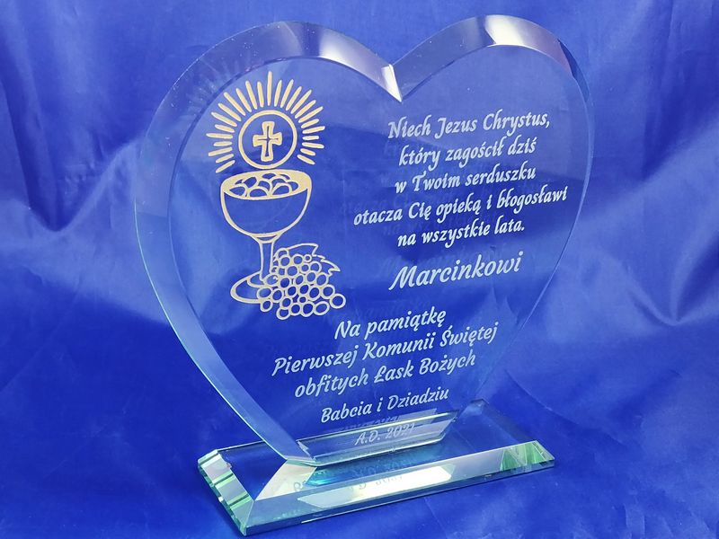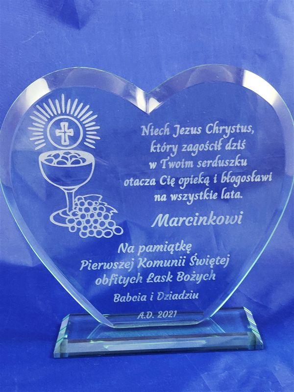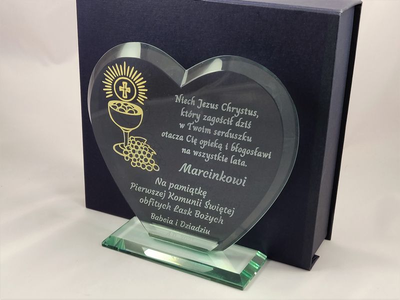 Pamiątka z okazji przyjęcia Pierwszej Komunii Świętej w postaci szklanej statuetki w kształcie serca z grawerem.