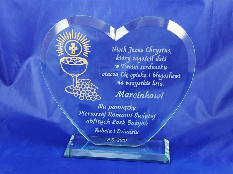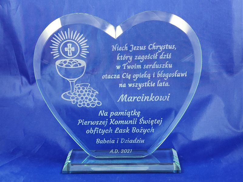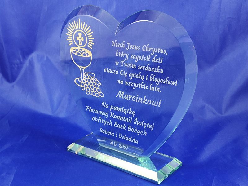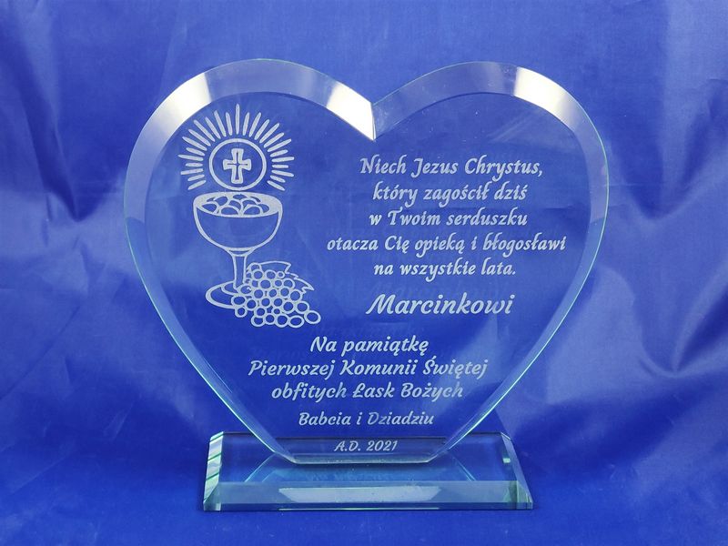 Szklane serce jest grawerowane jako pamiątka komunijna, ale można wykonać go także na inne okazje i uroczystości.