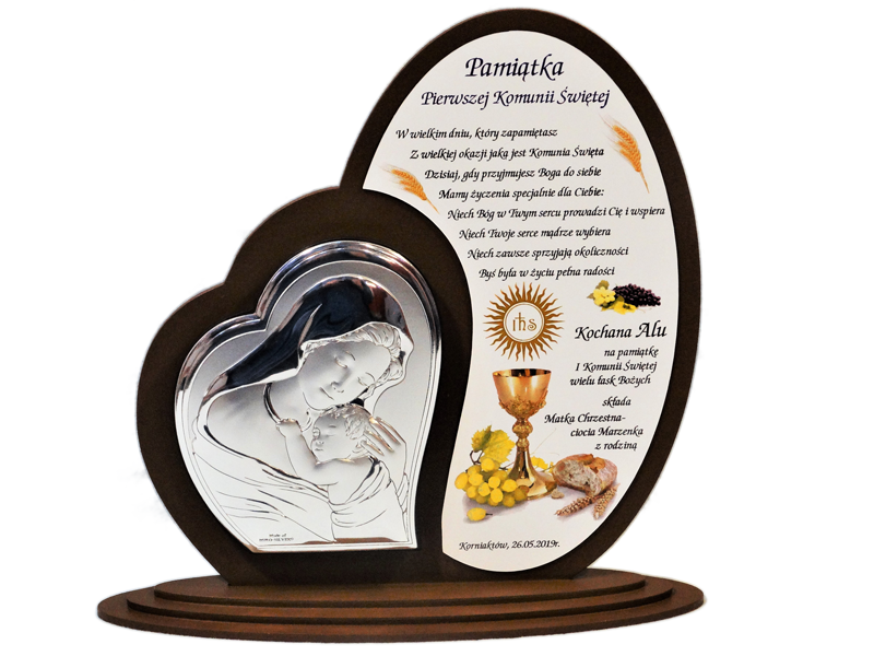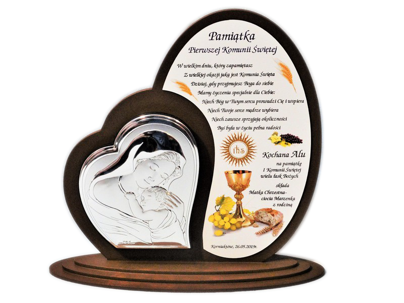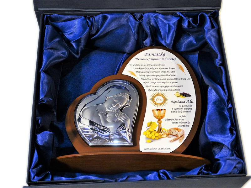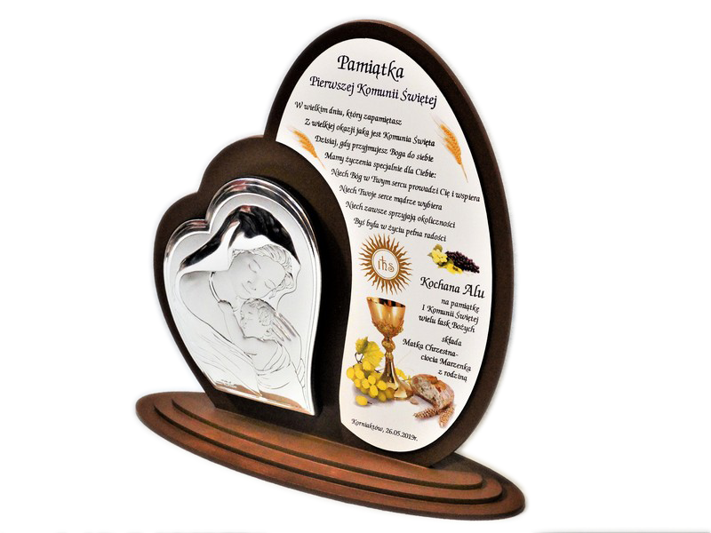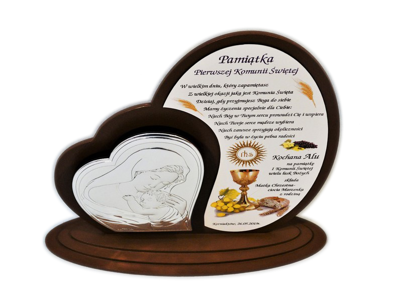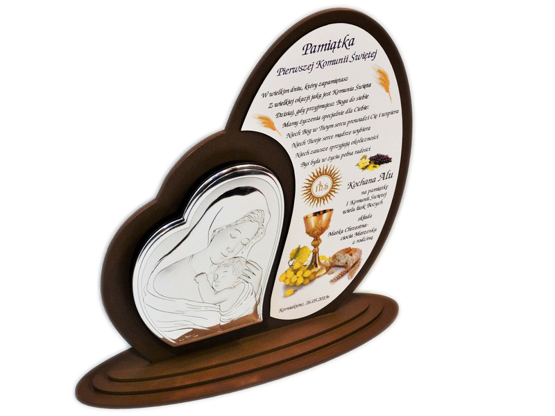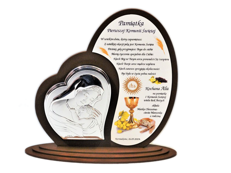 Wyjątkowy upominek na pamiątkę przyjęcia I Komunii Świętej w formie srebrnego obrazka umieszczonego na statuetce drewnianej.