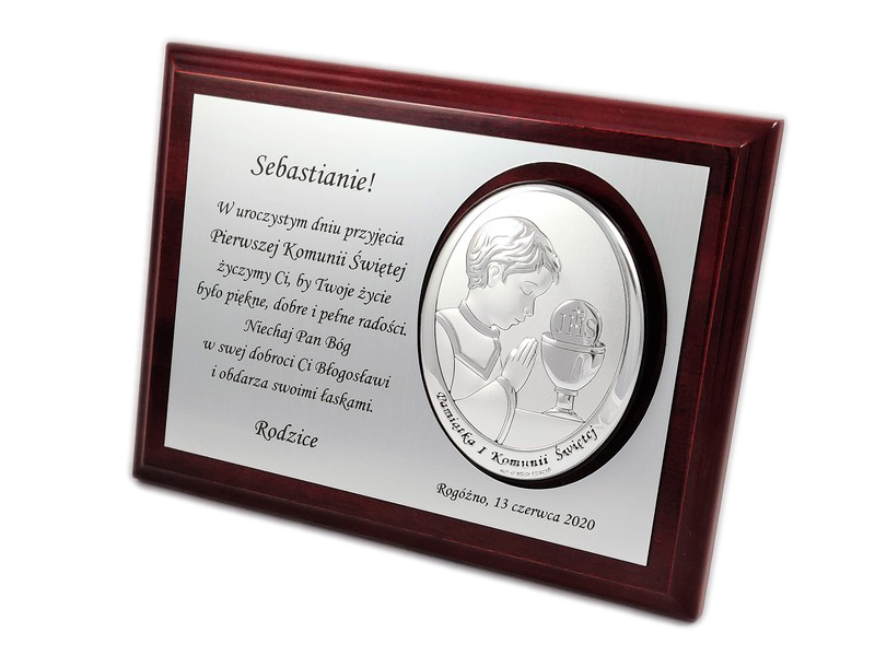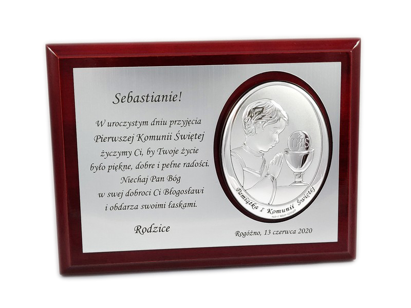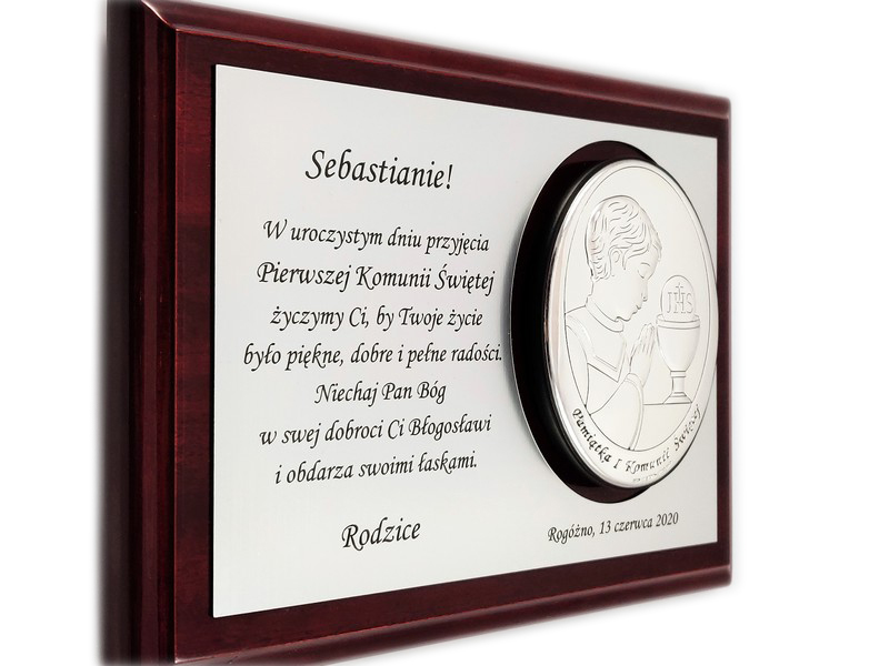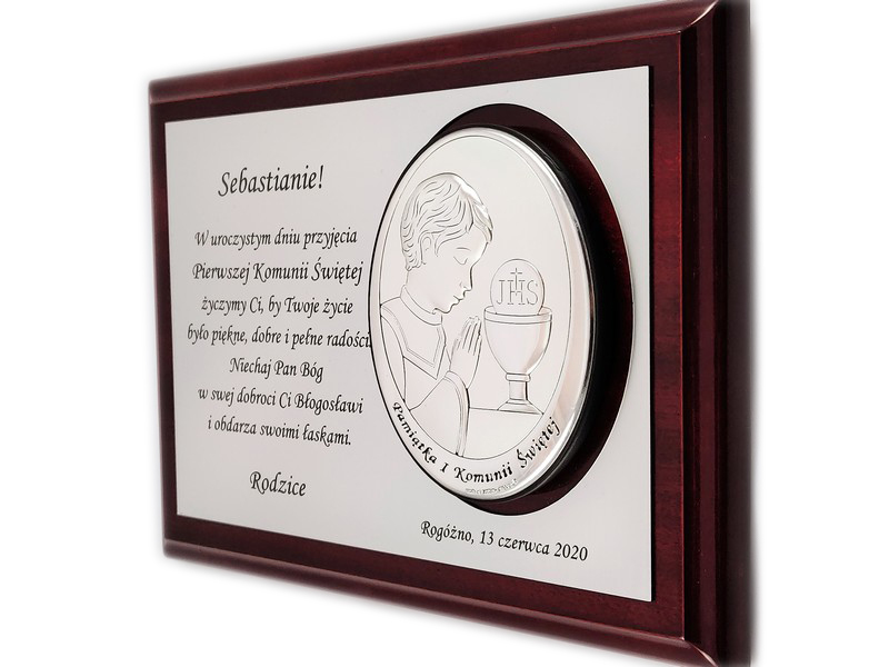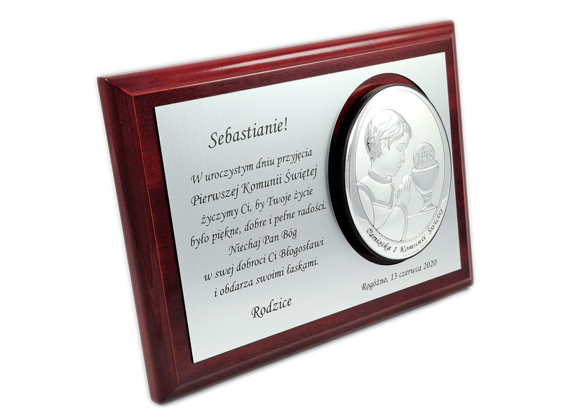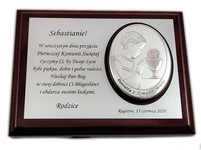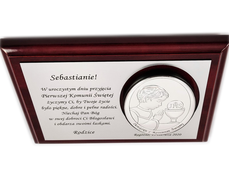 Pamiątkowa dedykacja wygrawerowana jest w srebrnym laminacie grawerskim, w którym dodatkowo wycięte jest miejsce na srebrny obrazek.