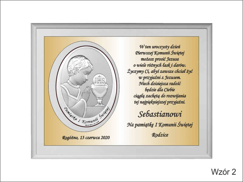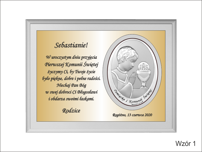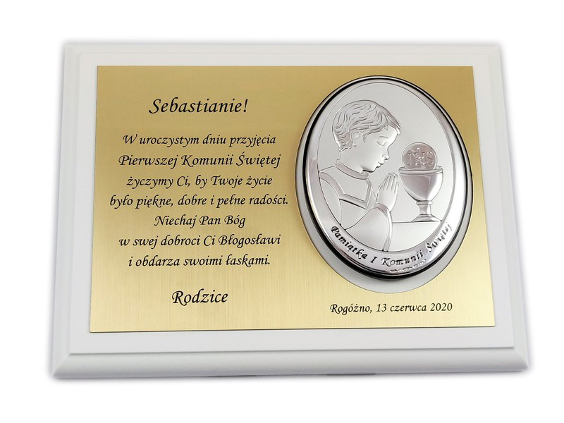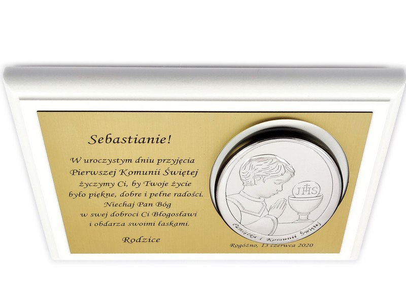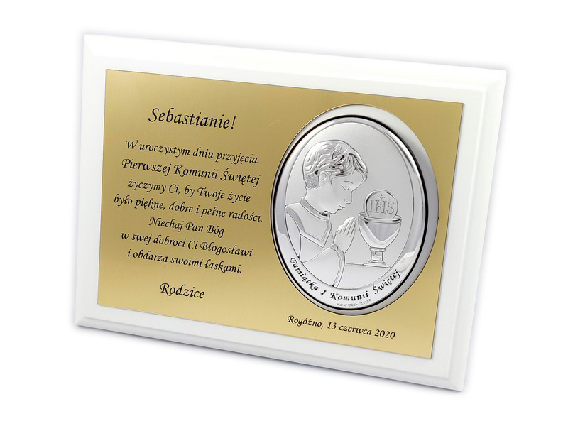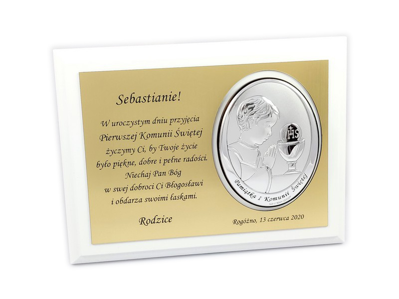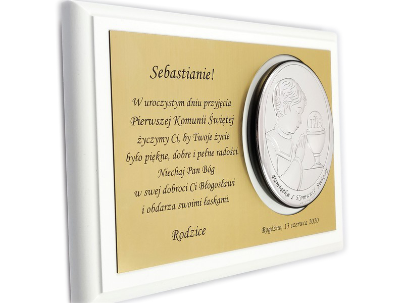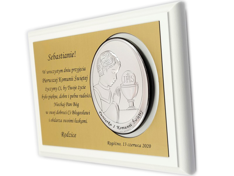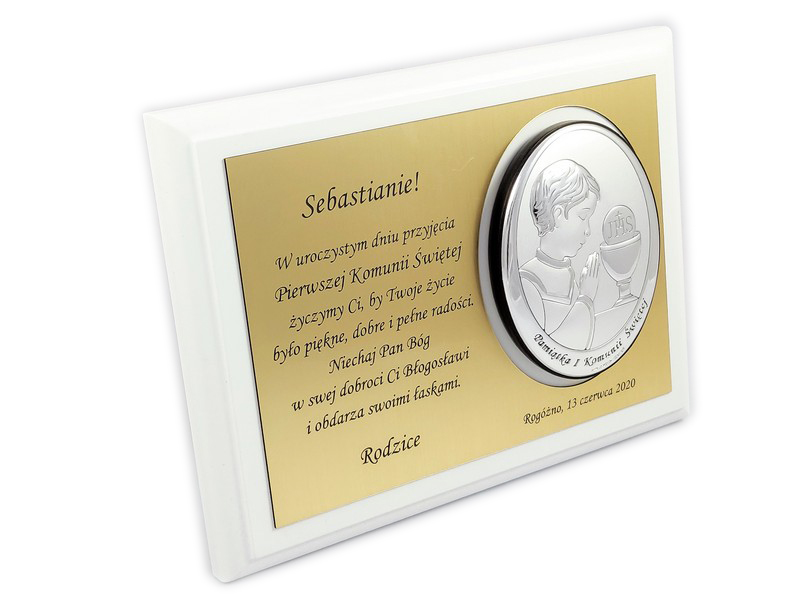 Pamiątkowa dedykacja wygrawerowana jest w złotym laminacie grawerskim, w którym dodatkowo wycięte jest miejsce na srebrny obrazek.