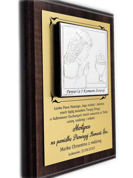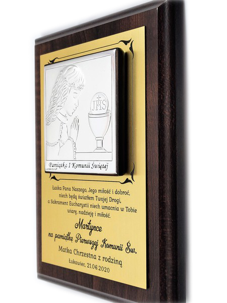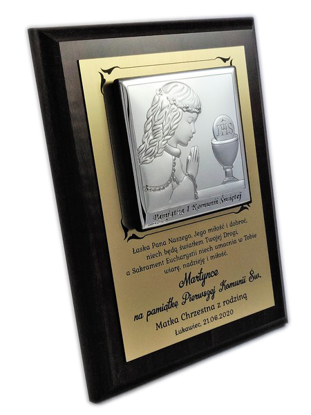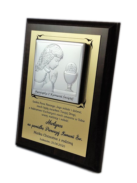 Pamiątkowa dedykacja wygrawerowana jest w złotym laminacie grawerskim, na którym umieszczony jest także obrazek.