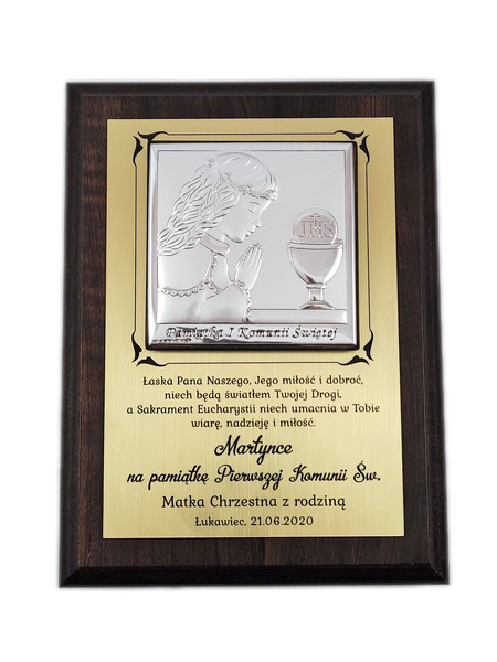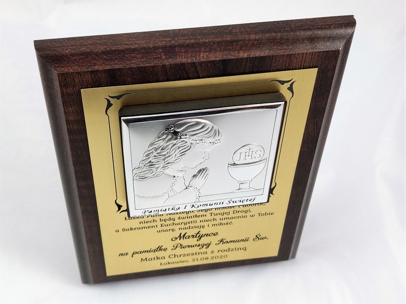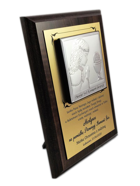 Upominek ma formę srebrnego obrazka 6568/1XA umieszczonego na złotej tabliczce z grawerem dedykacji i podkładzie drewnianym.