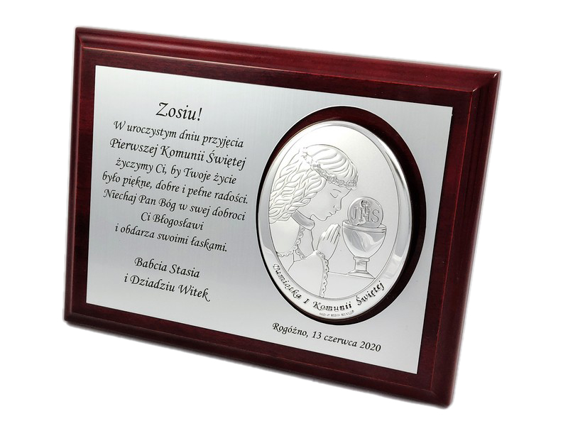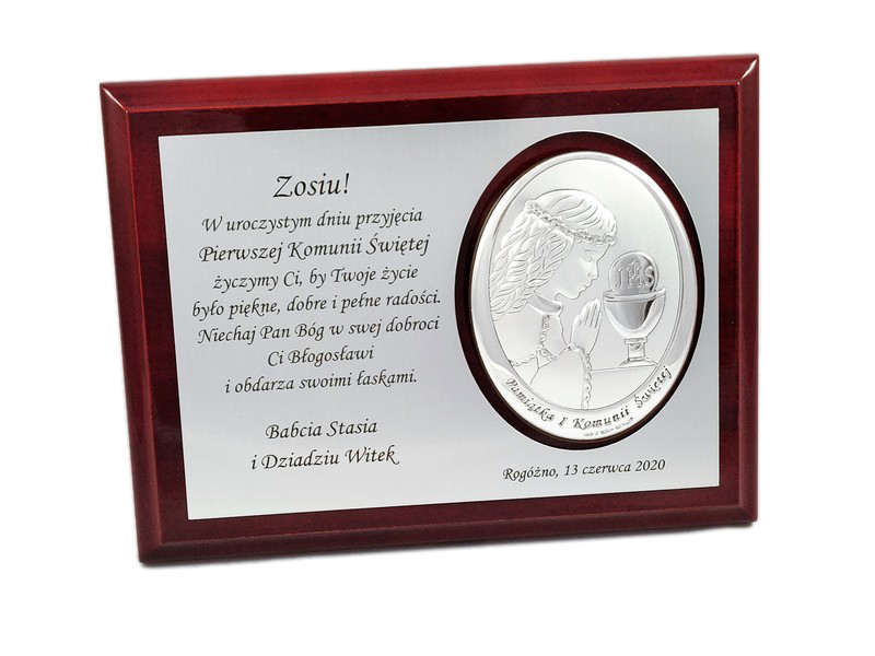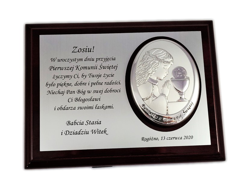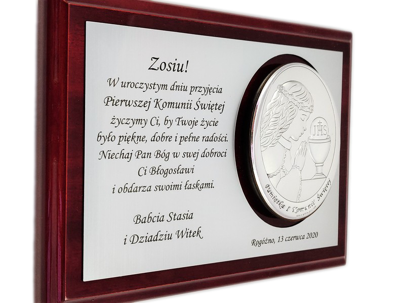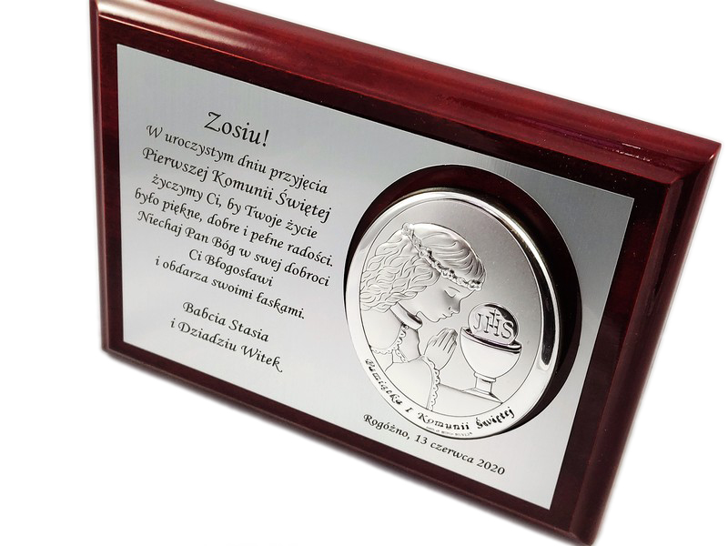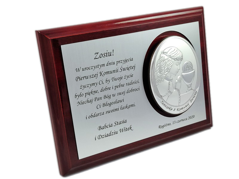 Pamiątkowa dedykacja wygrawerowana jest w srebrnym laminacie grawerskim, w którym dodatkowo wycięte jest miejsce na srebrny obrazek.