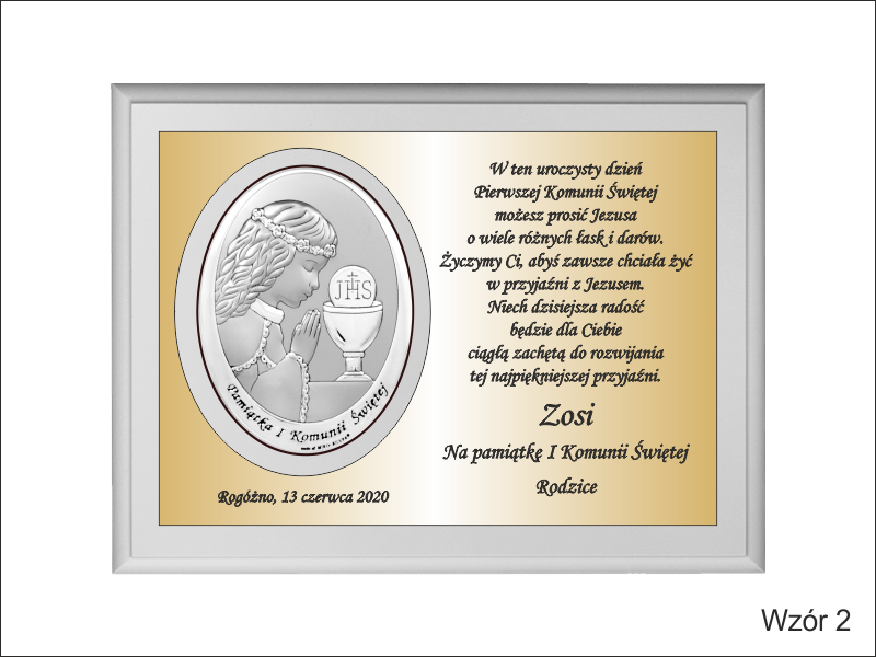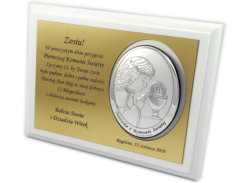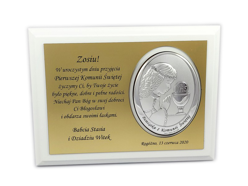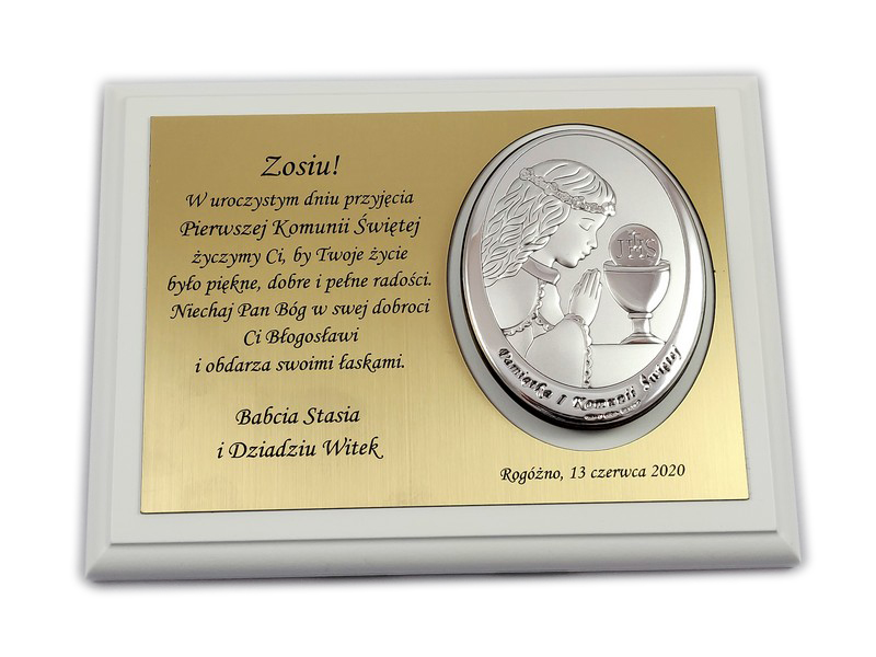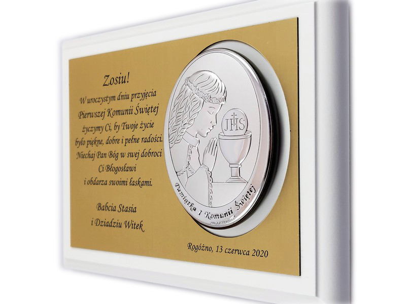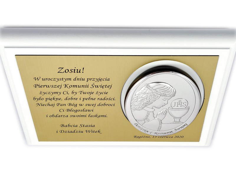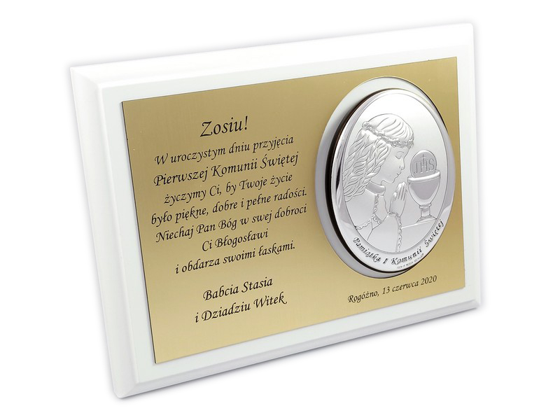 Pamiątkowa dedykacja wygrawerowana jest w złotym laminacie grawerskim, w którym dodatkowo wycięte jest miejsce na srebrny obrazek.