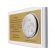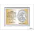 Upominek ma formę srebrnego obrazka oraz złotego grawerowanego laminatu umieszczonych na białym podkładzie drewnianym.