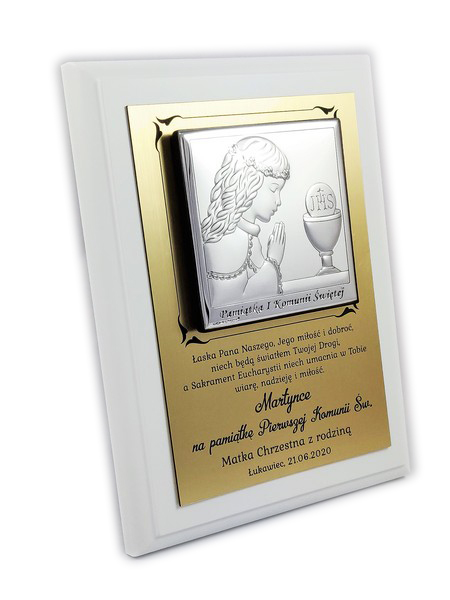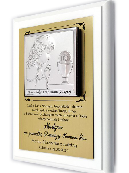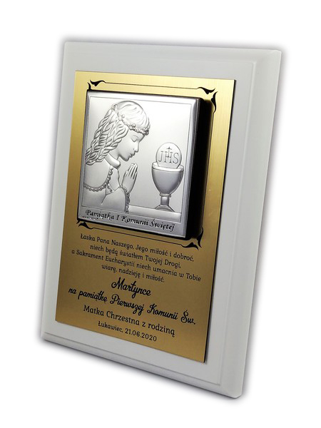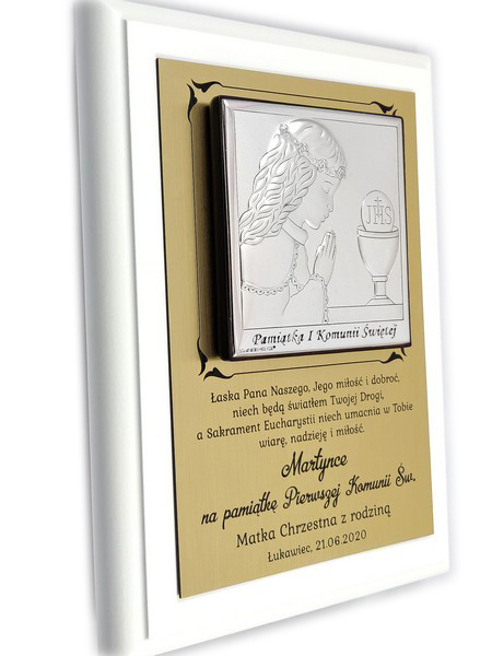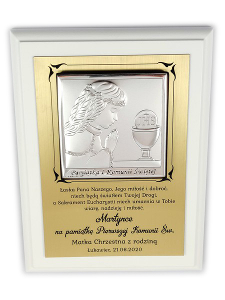 Srebrny obrazek ma wielkość 8 x 8 cm i przedstawia wizerunek dziewczynki z kielichem i Hostią.
