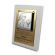 Upominek ma formę srebrnego obrazka oraz złotego grawerowanego laminatu umieszczonych na podkładzie drewnianym.