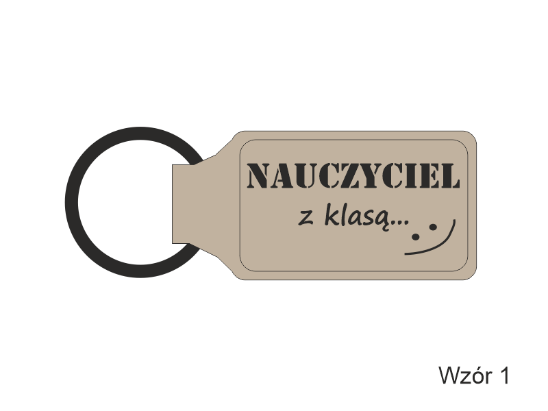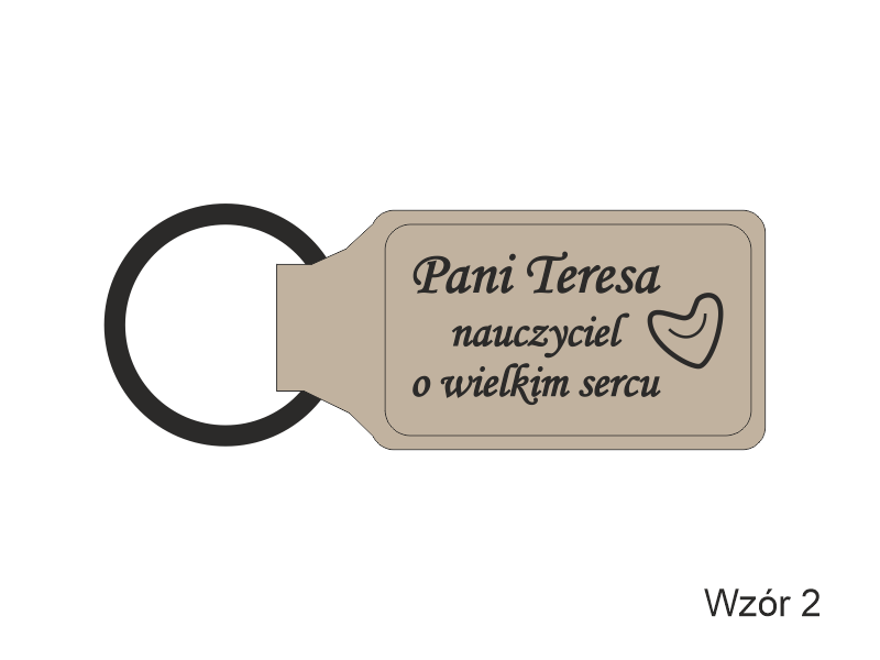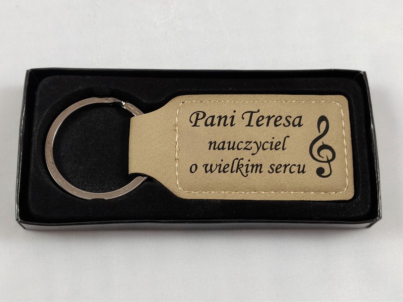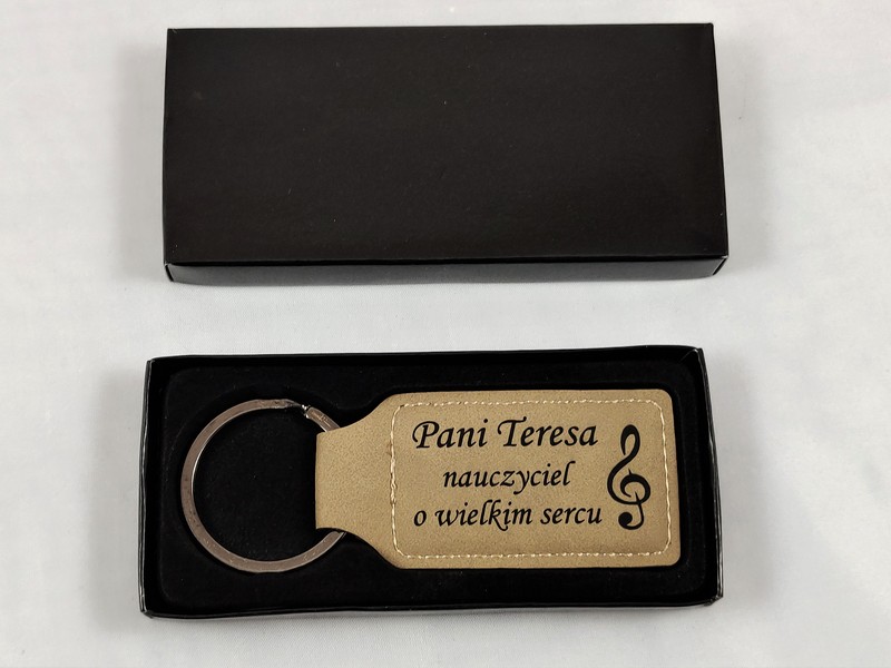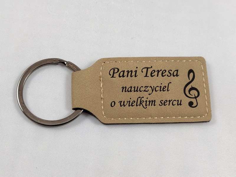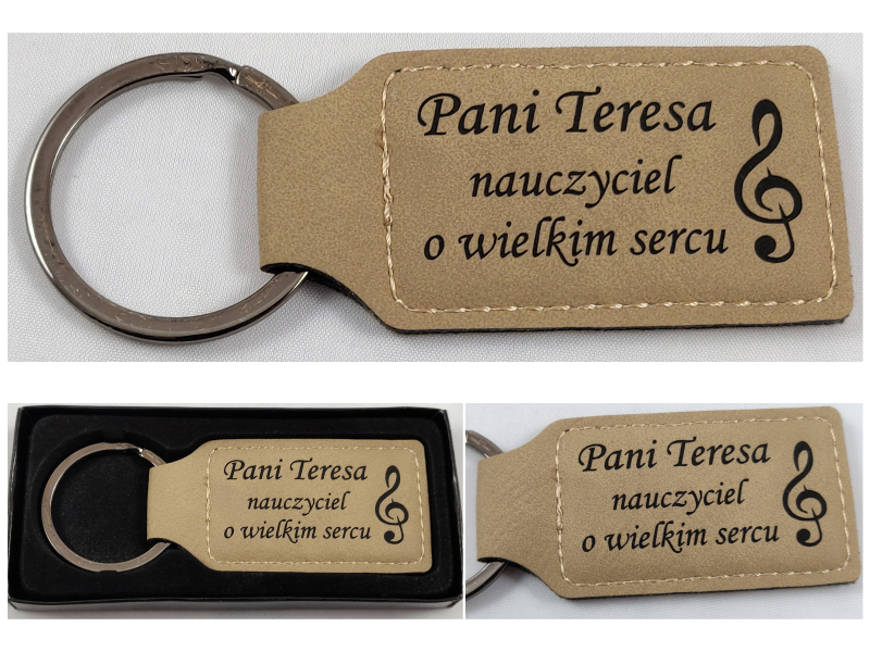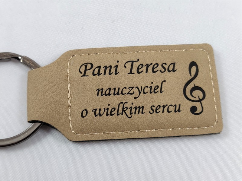 Upominek dla Nauczyciela w formie breloczka z ekosóry w prostokątnym kształcie z grawerem dedykacji.