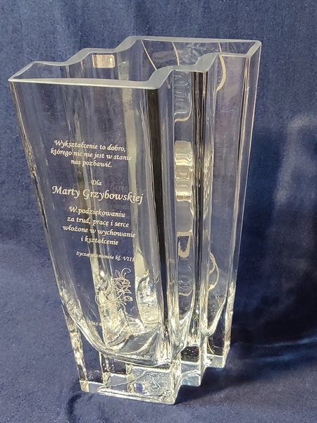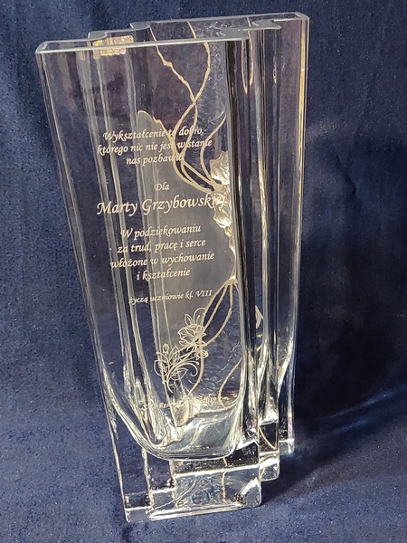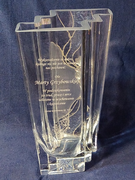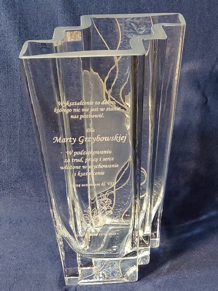 Na wazonie wykonany jest grawer pamiątkowej dedykacji dla nauczyciela.