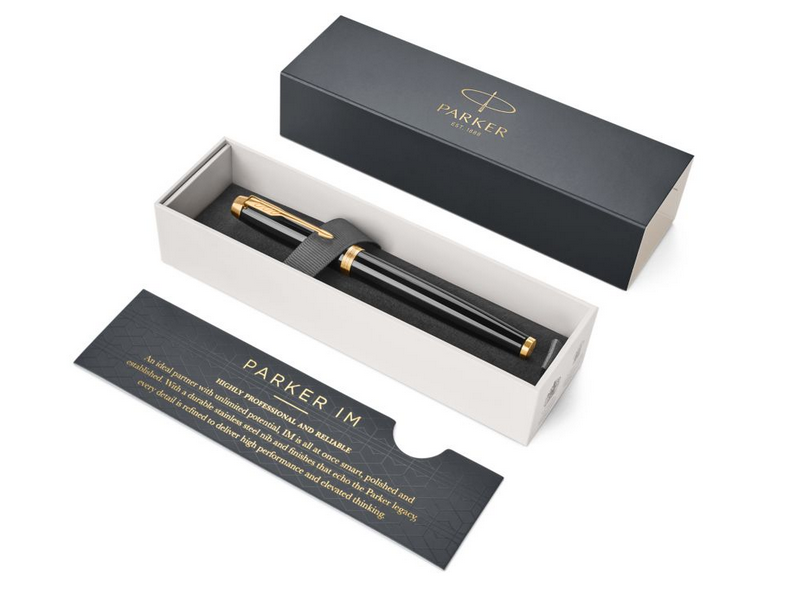 Doskonałe połączenie formy i funkcjonalności. Korpus oraz skuwkę pióra wiecznego Parker IM Core Black GT wykonano z mosiądzu pokrytego czarnym lakierem. Uchwyt wykonany jest z połyskującego, czarnego materiału polimerowego. Całość wieńczą wykończenia platerowane złotem. Stalówka wykonana z wysokiej jakości stali szlachetnej.